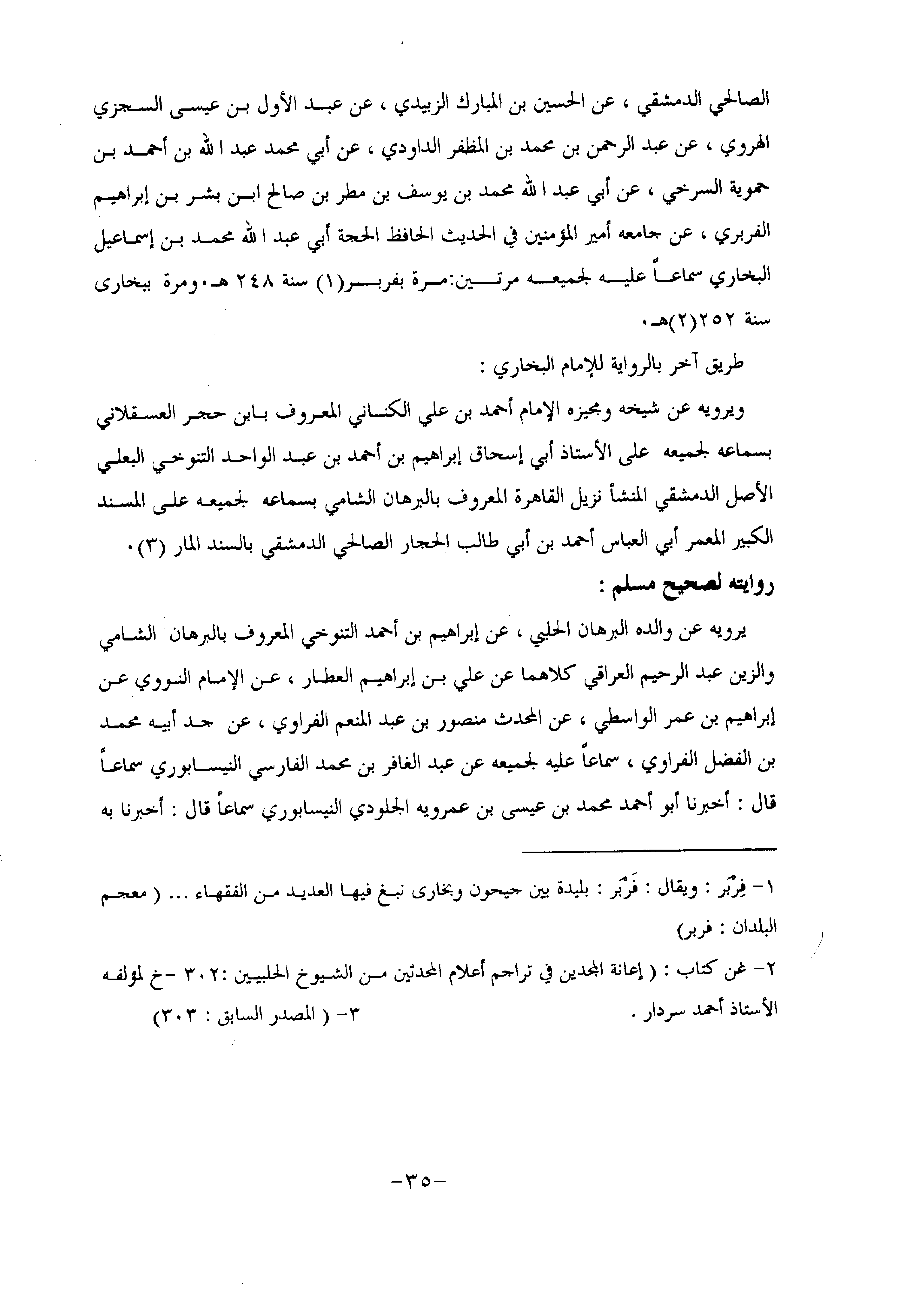الصالحي الدمشقي، عن الحسين بن المبارك الزبيدي، عن عبد الأول بن عيسى السجزي الهروي، عن عبد الرحمن بن محمد بن المظفر الداودي، عن أبي محمد عبد الله بن أحمد بن حموية السرخي، عن أبي عبد الله محمد بن يوسف بن مطر بن صالح ابن بشر بن إبراهيم الفربري، عن جامعة أمير المؤمنين في الحديث الحافظ الحجة أبي عبد الله محمد بن إسماعيل البخاري سماعا عليه لجميعه مرتين: مرة بفربر «1» سنة 248 هـ. ومرة ببخارى سنة 252 «2» هـ.