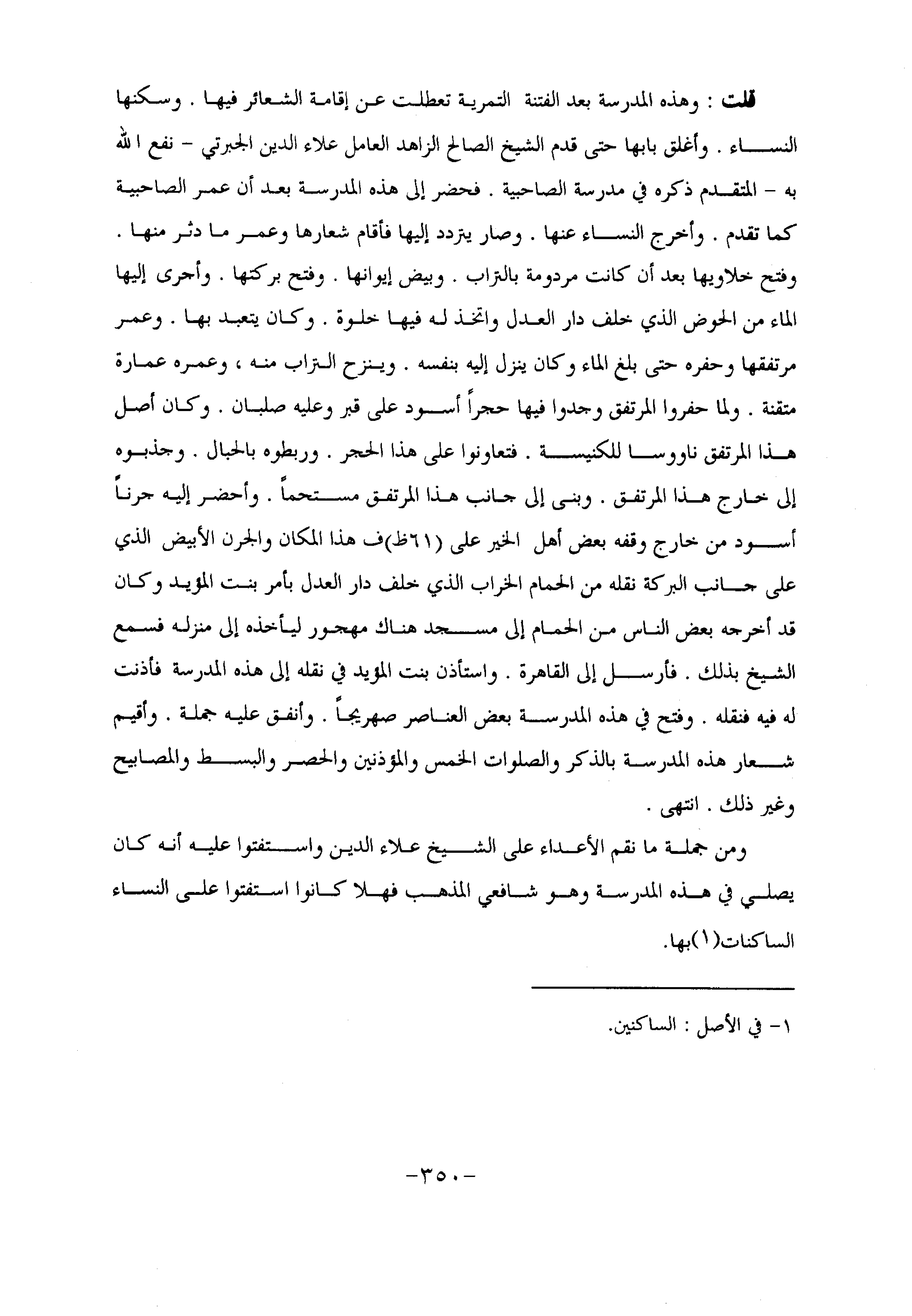 قلت: وهذه المدرسة بعد الفتنة التمرية تعطلت عن إقامة الشعائر فيها. وسكنها النساء. وأغلق بابها حتى قدم الشيخ الصالح الزاهد العامل علاء الدين الجبرتي- نفع الله به- المتقدم ذكره في مدرسة الصاحبية. فحضر إلى هذه المدرسة بعد أن عمر الصاحبية كما تقدم. وأخرج النساء عنها. وصار يتردد إليها فأقام شعارها وعمر ما دثر منها.