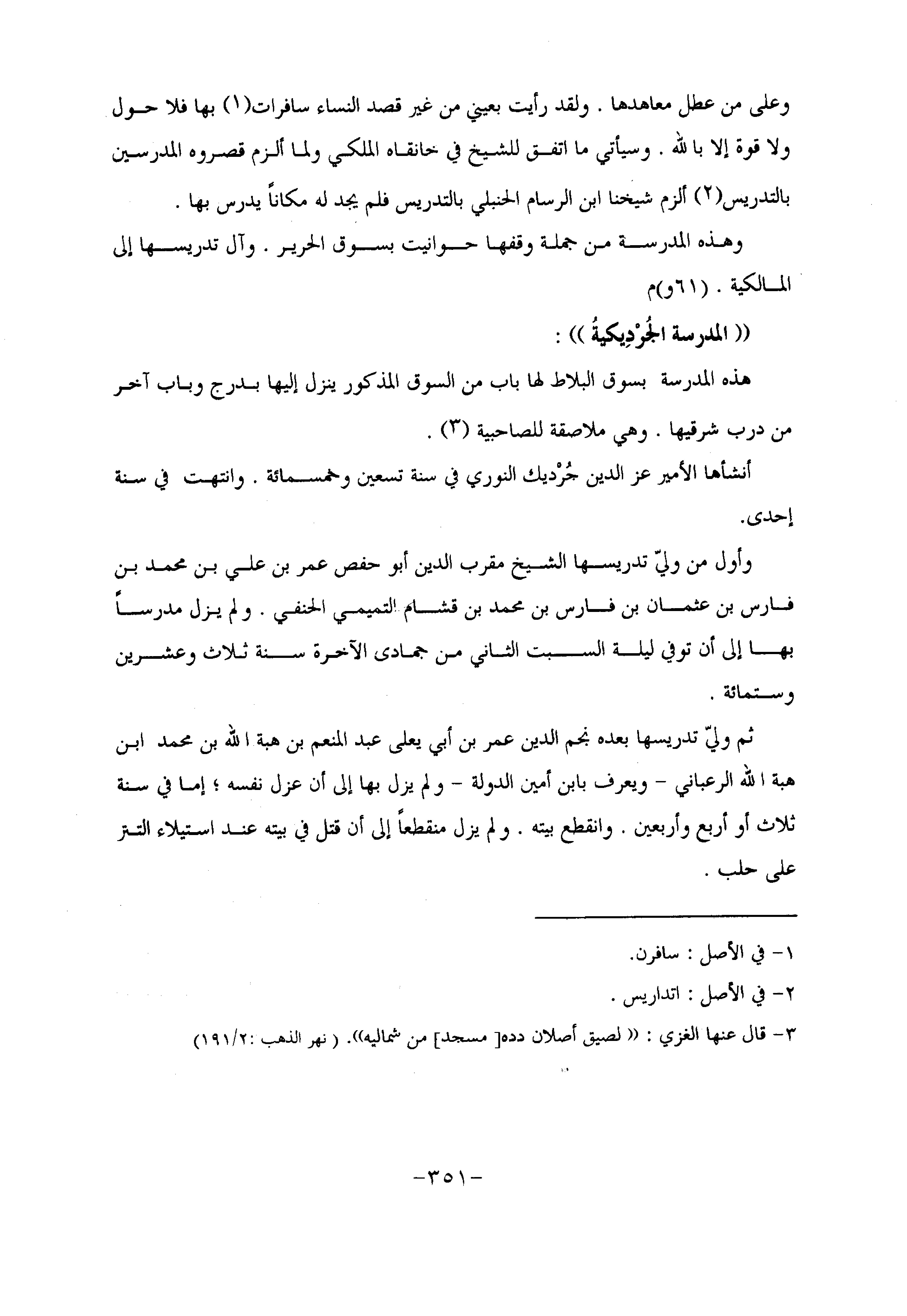 وعلى من عطل معاهدها. ولقد رأيت بعيني من غير قصد النساء سافرات «1» بها فلا حول ولا قوة إلا بالله. وسيأتي ما اتفق للشيخ في خانقاه الملكي ولما ألزم قصروه المدرسين بالتدريس «2» ألزم شيخنا ابن الرسام الحنبلي بالتدريس فلم يجد له مكانا يدرس بها.