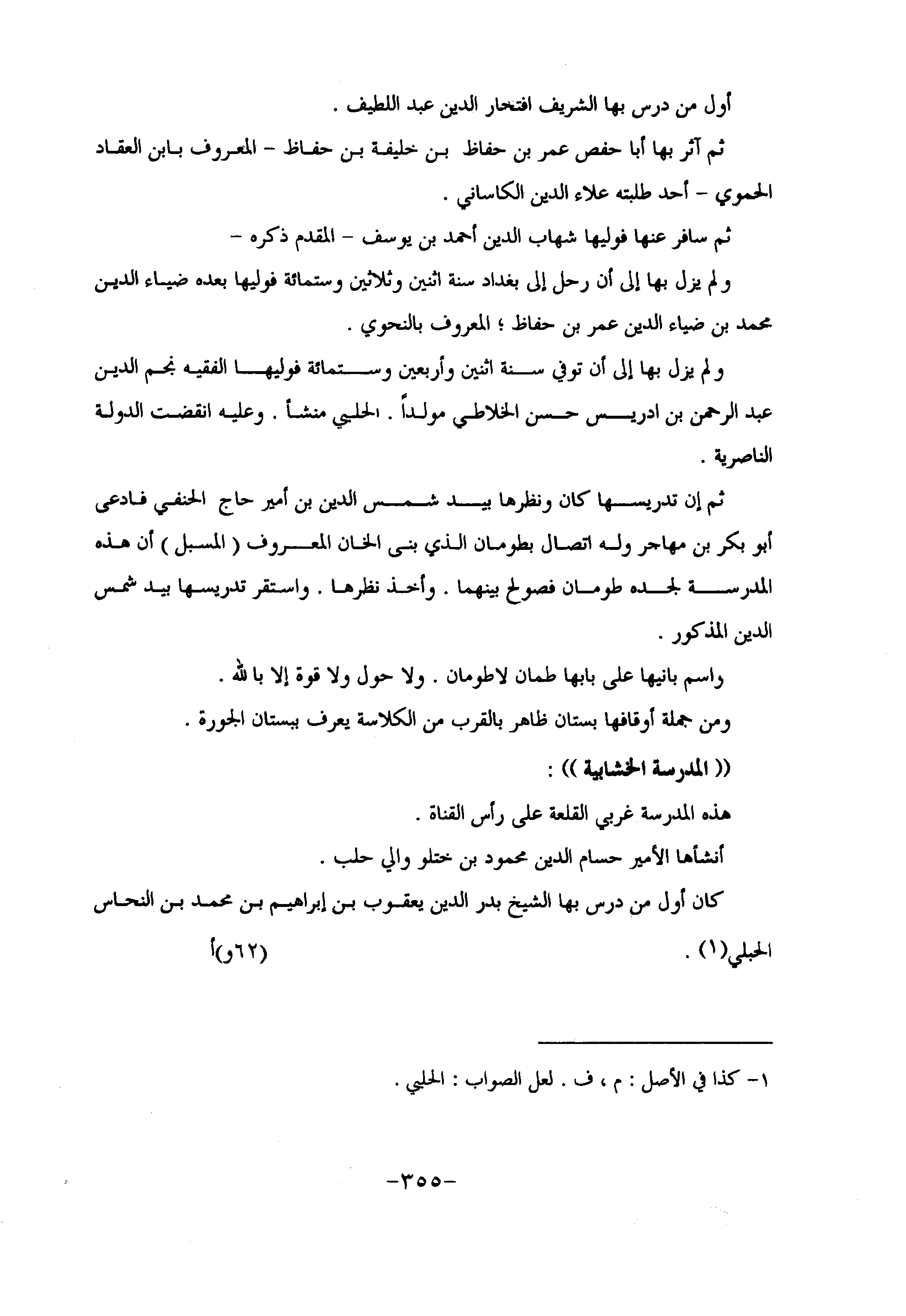 كان أول من درس بها الشيخ بدر الدين يعقوب بن إبراهيم بن محمد بن النحاس الحبلي «1» . (62 و) أ