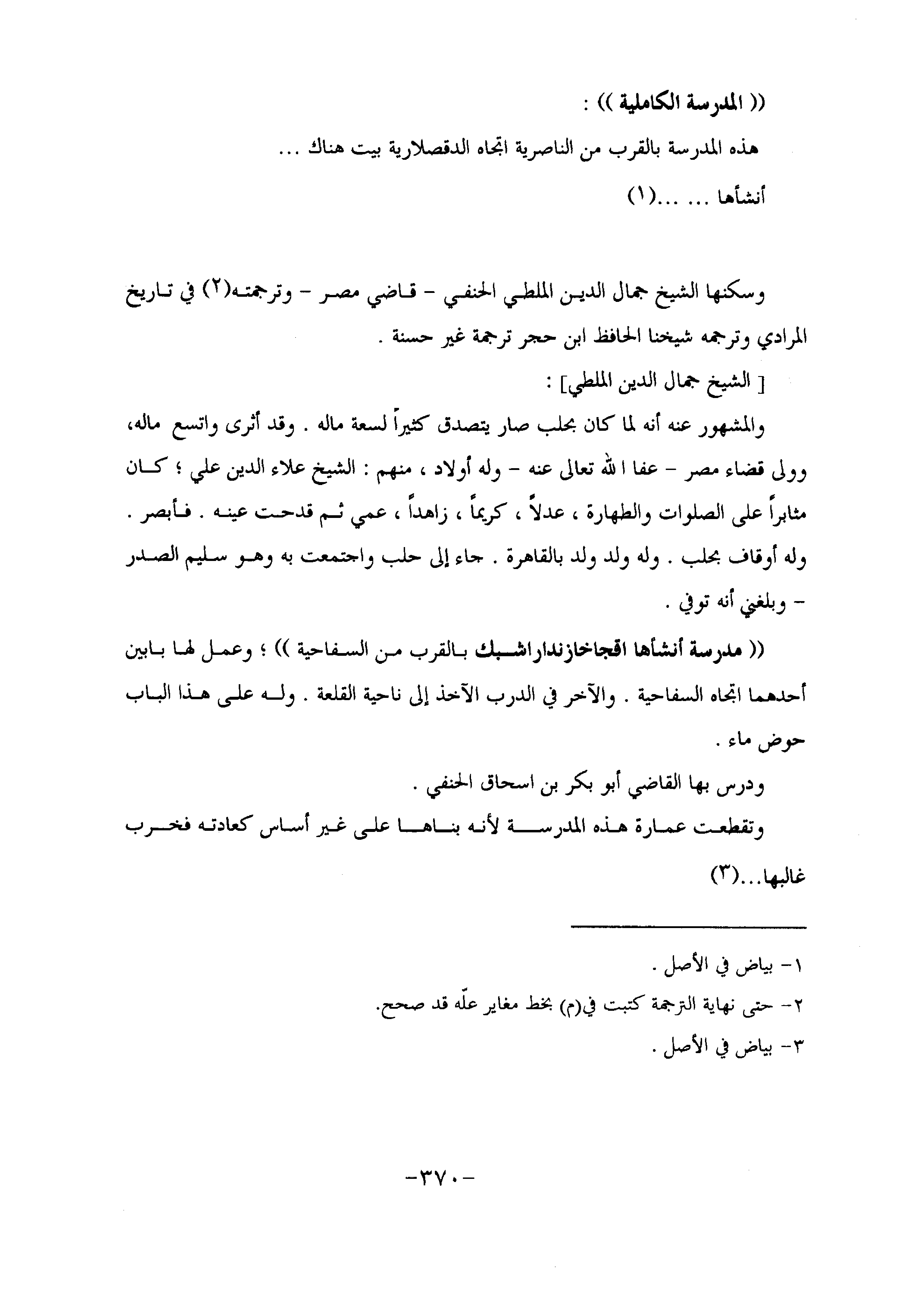 وسكنها الشيخ جمال الدين الملطي الحنفي- قاضي مصر- وترجمته «2» في تاريخ المرادي وترجمه شيخنا الحافظ ابن حجر ترجمة غير حسنة.