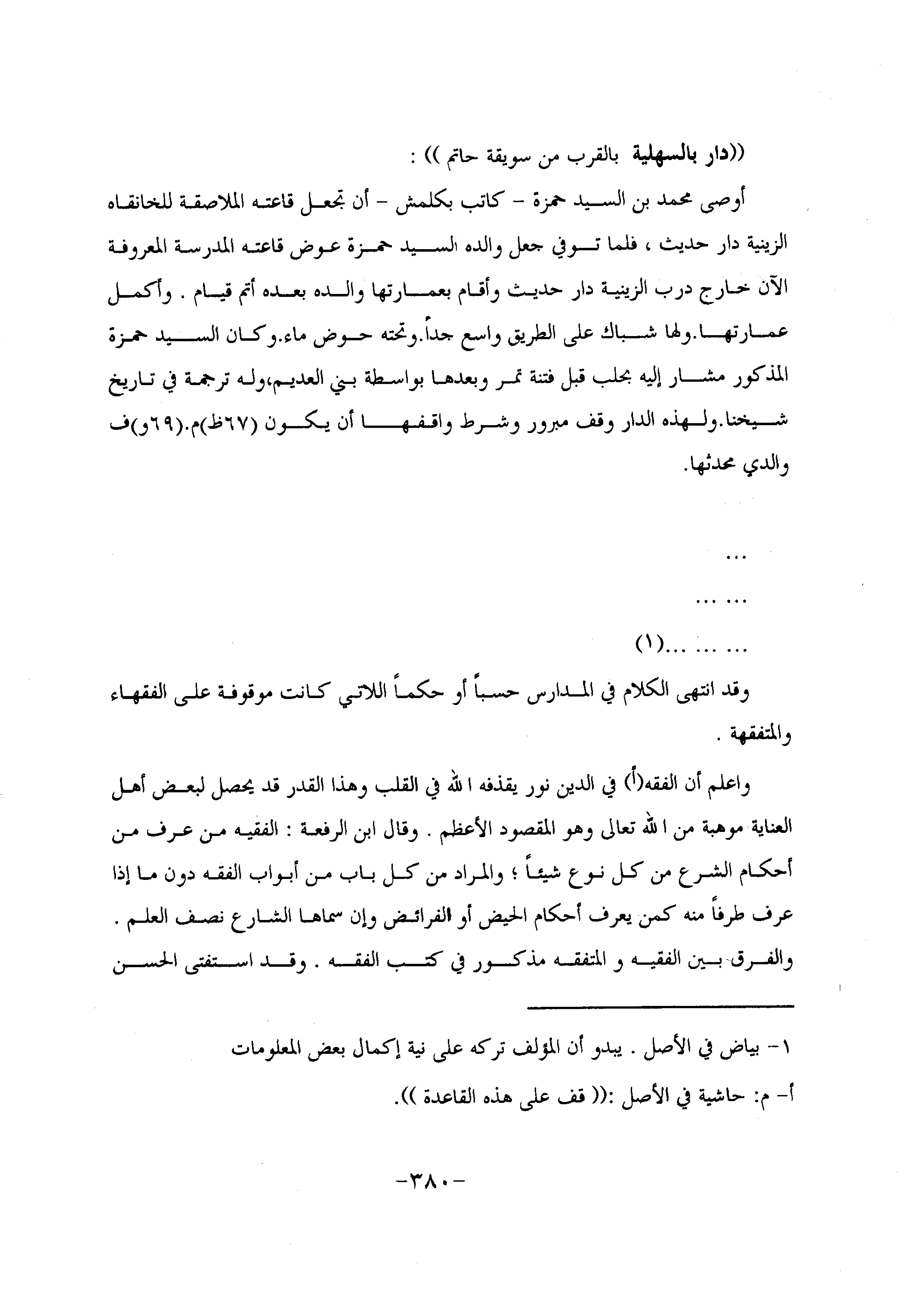 أوصى محمد بن السيد حمزة- كاتب بكلمش- أن تجعل قاعته الملاصقة للخانقاه الزينية دار حديث، فلما توفي جعل والده السيد حمزة عوض قاعته المدرسة المعروفة الآن خارج درب الزينية دار حديث وأقام بعمارتها والده بعده أتم قيام. وأكمل عمارتها. ولها شباك على الطريق واسع جدا. وتحته حوض ماء. وكان السيد حمزة المذكور مشار إليه بحلب قبل فتنة تمر وبعدها بواسطة بني العديم، وله ترجمة في تاريخ شيخنا. ولهذه الدار وقف مبرور وشرط واقفها أن يكون (67 ظ) م. (69 و) ف والدي محدثها.