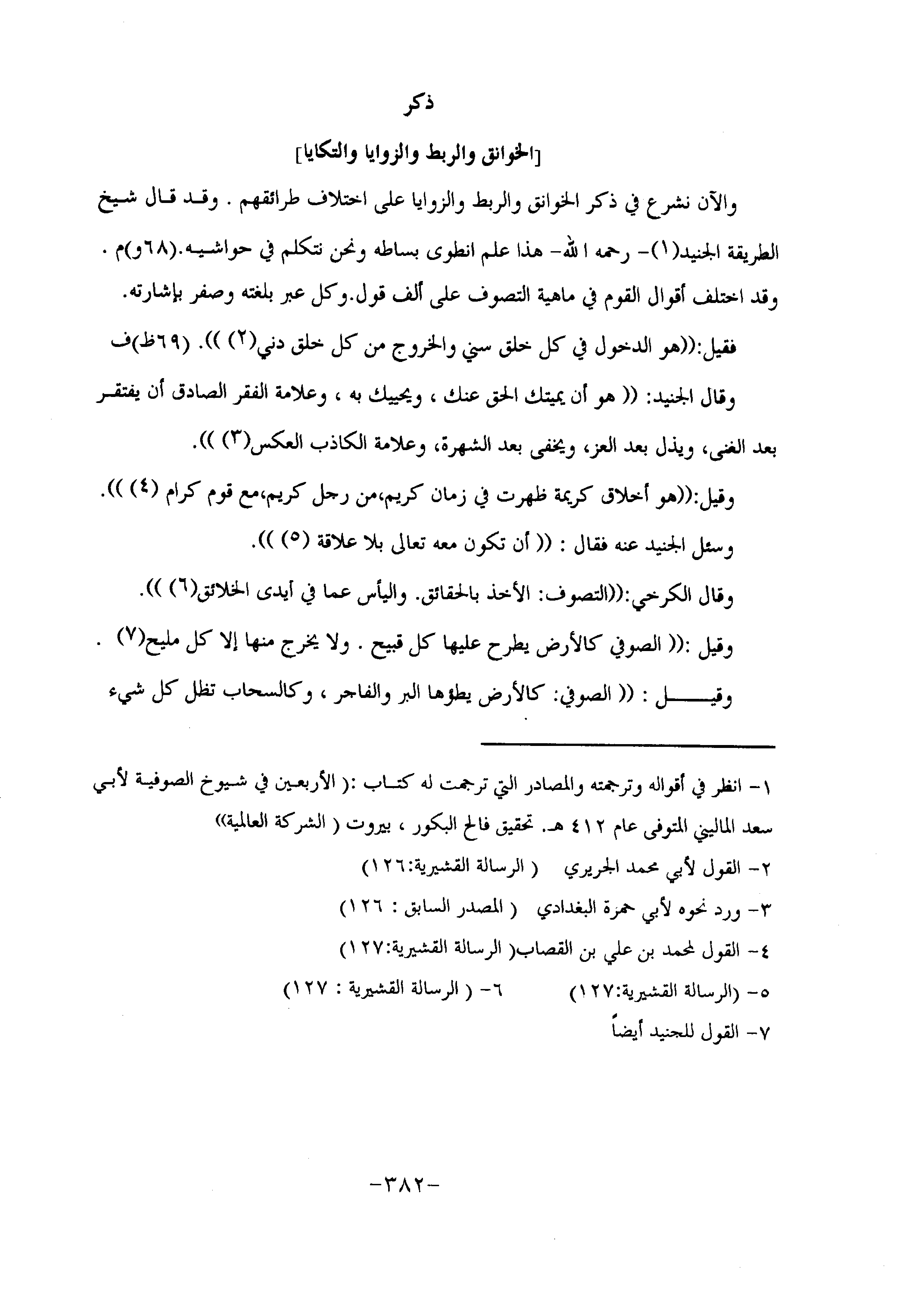 والآن نشرع في ذكر الخوانق والربط والزوايا على اختلاف طرائقهم. وقد قال شيخ الطريقة الجنيد «1» - رحمه الله- هذا علم انطوى بساطه ونحن نتكلم في حواشيه. (68 و) م.