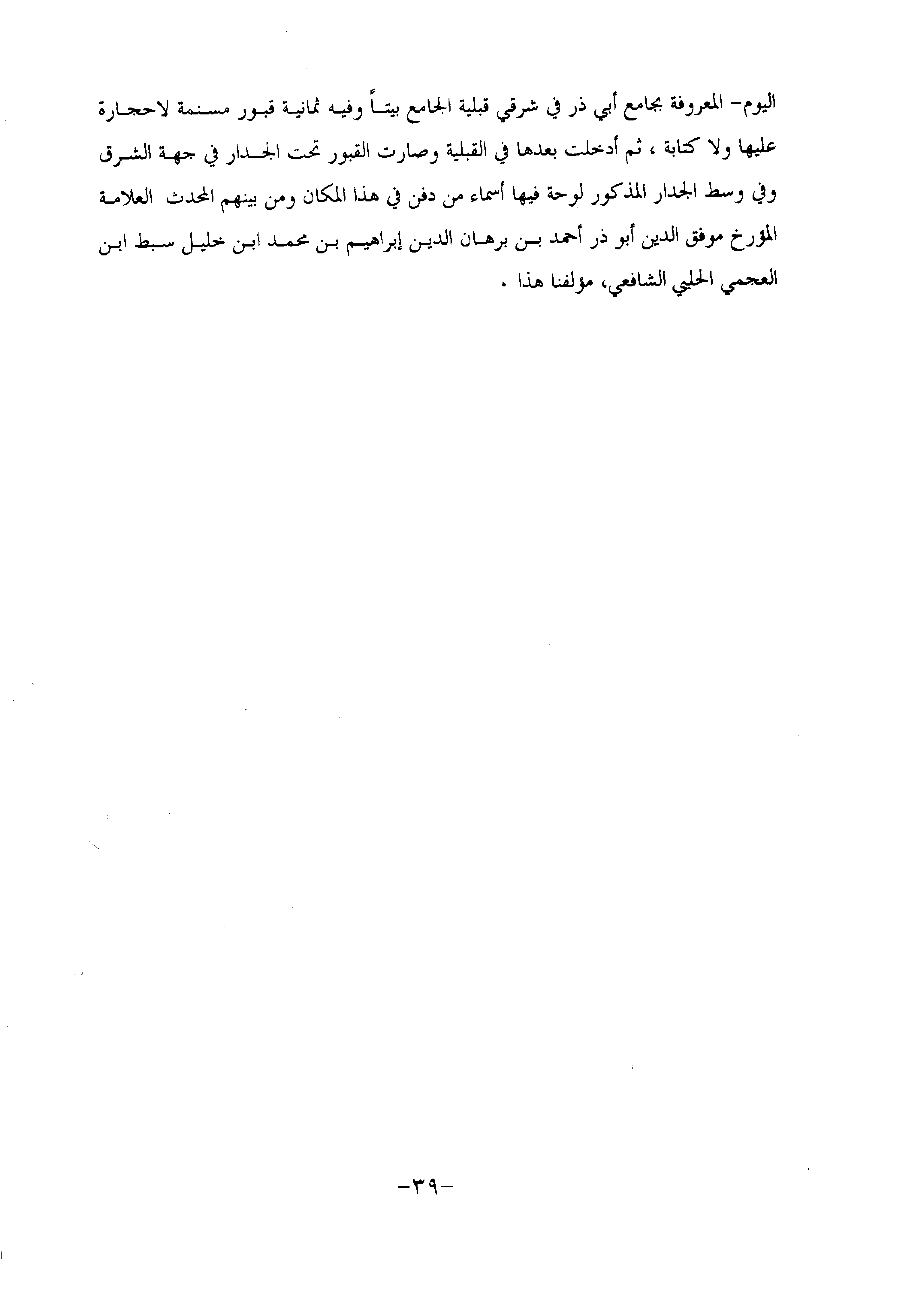 اليوم- المعروفة بجامع أبي ذر في شرقي قبلية الجامع بيتا وفيه ثمانية قبور مسنمة لاحجارة عليها ولا كتابة، ثم أدخلت بعدها في القبلية وصارت القبور تحت الجدار في جهة الشرق وفي وسط الجدار المذكور لوحة فيها أسماء من دفن في هذا المكان ومن بينهم المحدث العلامة المؤرخ موفق الدين أبو ذر أحمد بن برهان الدين إبراهيم بن محمد ابن خليل سبط ابن العجمي الحلبي الشافعي، مؤلفنا هذا.