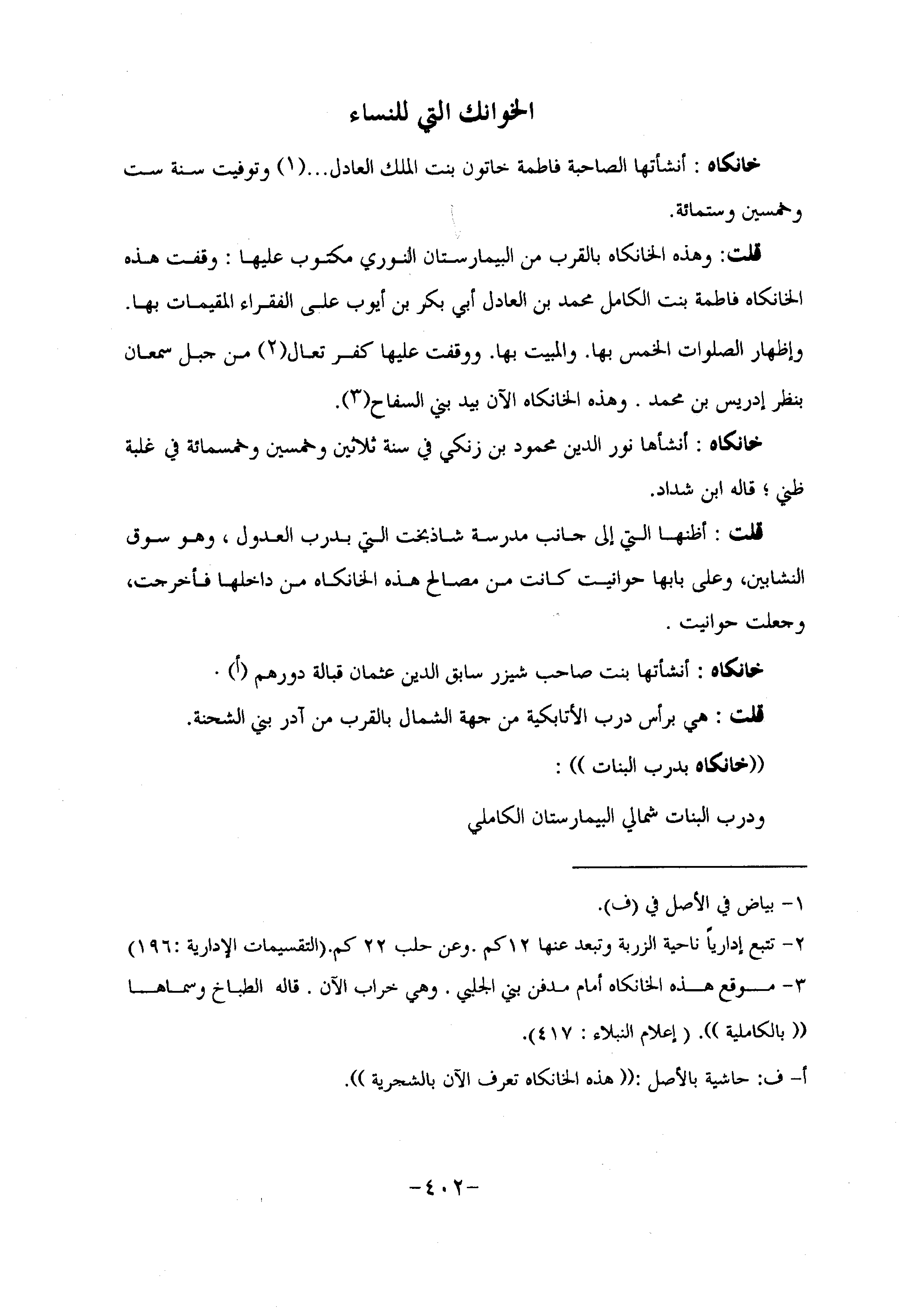 قلت: وهذه الخانكاه بالقرب من البيمارستان النوري مكتوب عليها: وقفت هذه الخانكاه فاطمة بنت الكامل محمد بن العادل أبي بكر بن أيوب على الفقراء المقيمات بها.