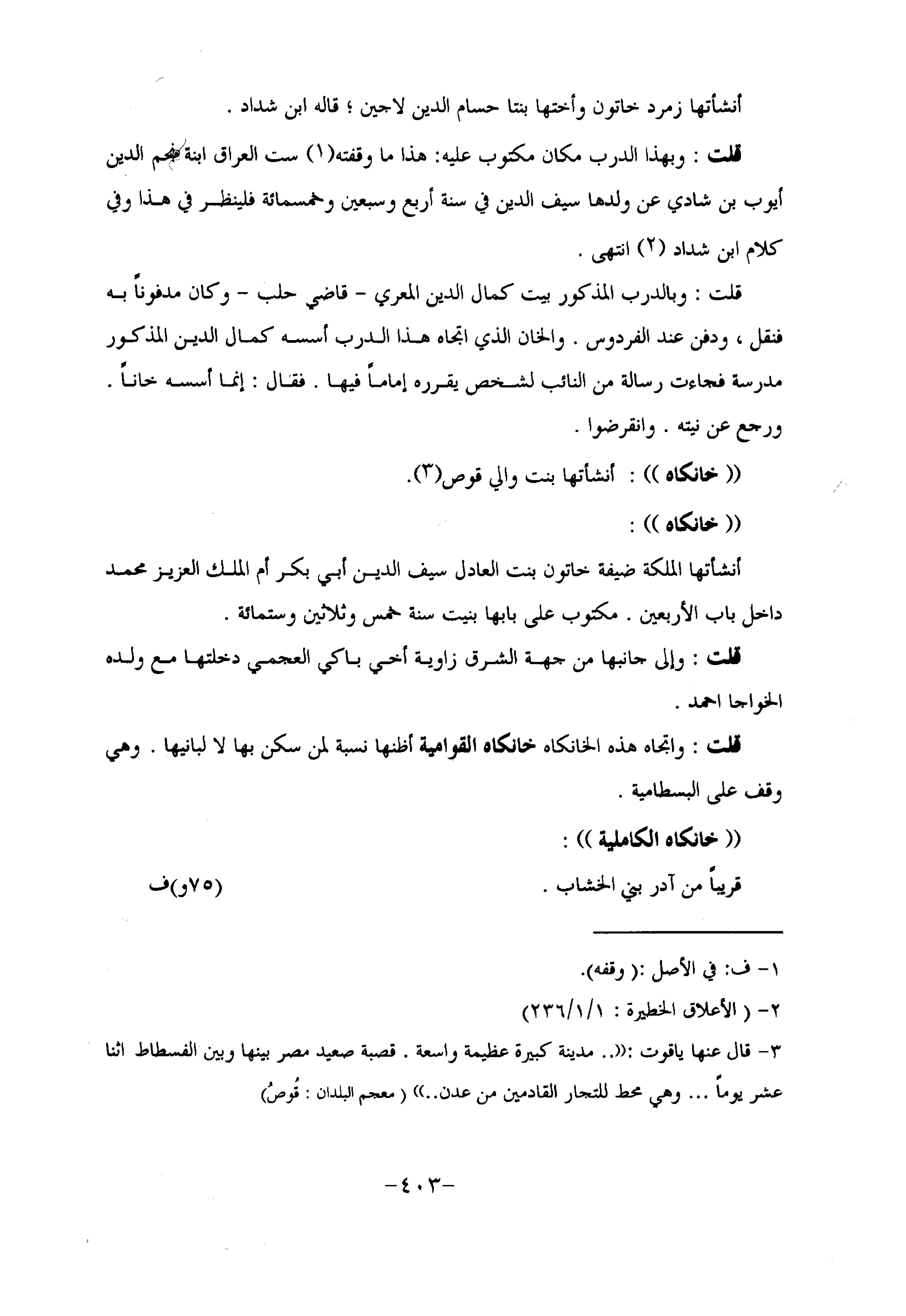 قلت: وبالدرب المذكور بيت كمال الدين المعري- قاضي حلب- وكان مدفونا به فنقل، ودفن عند الفردوس. والخان الذي اتجاه هذا الدرب أسسه كمال الدين المذكور مدرسة فجاءت رسالة من النائب لشخص يقرره إماما فيها. فقال: إنما أسسه خانا.