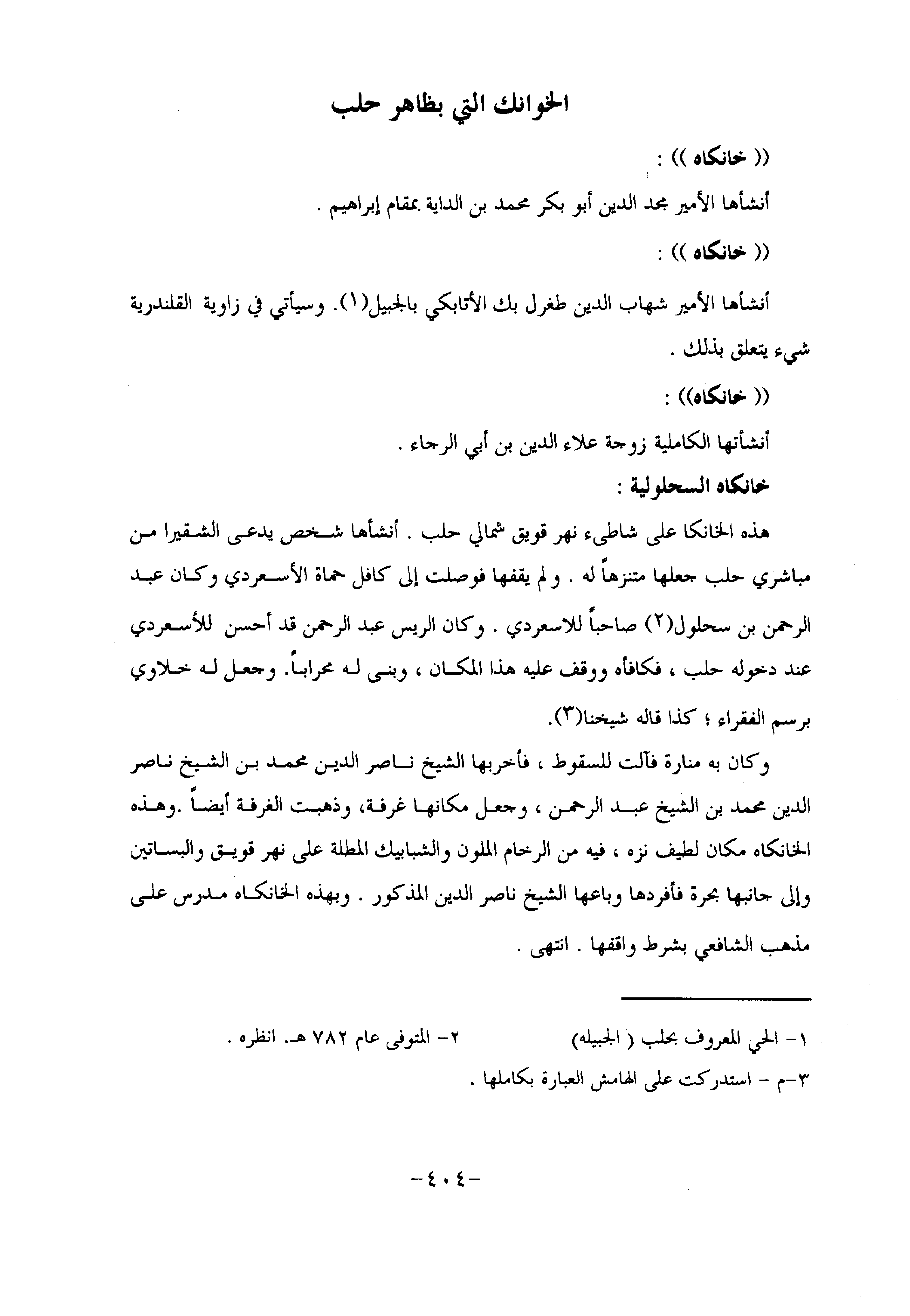 هذه الخانكا على شاطئ نهر قويق شمالي حلب. أنشأها شخص يدعى الشقيرا من مباشري حلب جعلها متنزها له. ولم يقفها فوصلت إلى كافل حماة الأسعردي وكان عبد الرحمن بن سحلول «2» صاحبا للاسعردي. وكان الريس عبد الرحمن قد أحسن للأسعردي عند دخوله حلب، فكافأه ووقف عليه هذا المكان، وبنى له محرابا. وجعل له خلاوي برسم الفقراء؛ كذا قاله شيخنا «3» .