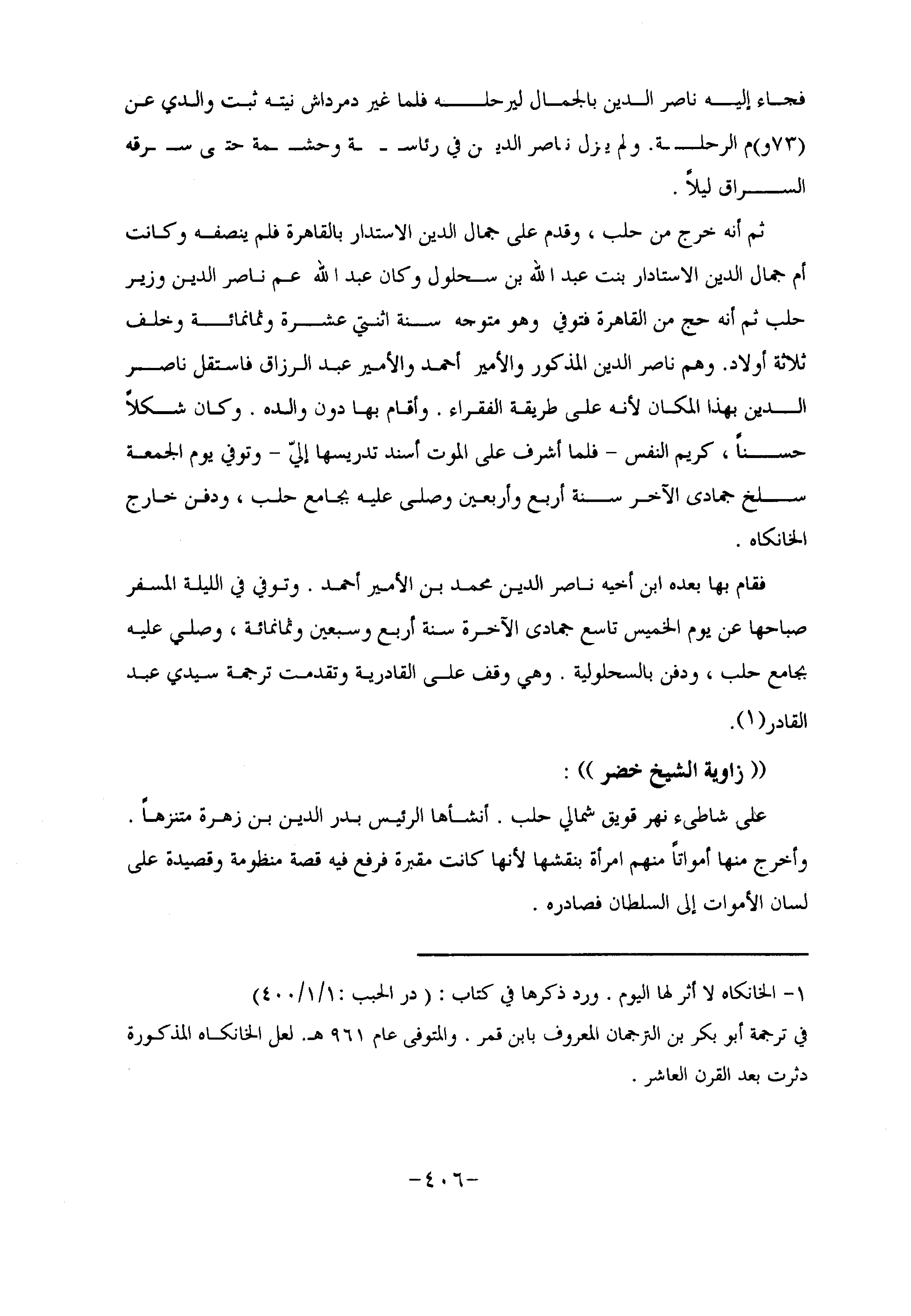 فقام بها بعده ابن أخيه ناصر الدين محمد بن الأمير أحمد. وتوفي في الليلة المسفر صباحها عن يوم الخميس تاسع جمادى الآخرة سنة أربع وسبعين وثمانمائة، وصلي عليه بجامع حلب، ودفن بالسحلولية. وهي وقف على القادرية وتقدمت ترجمة سيدي عبد القادر «1» .