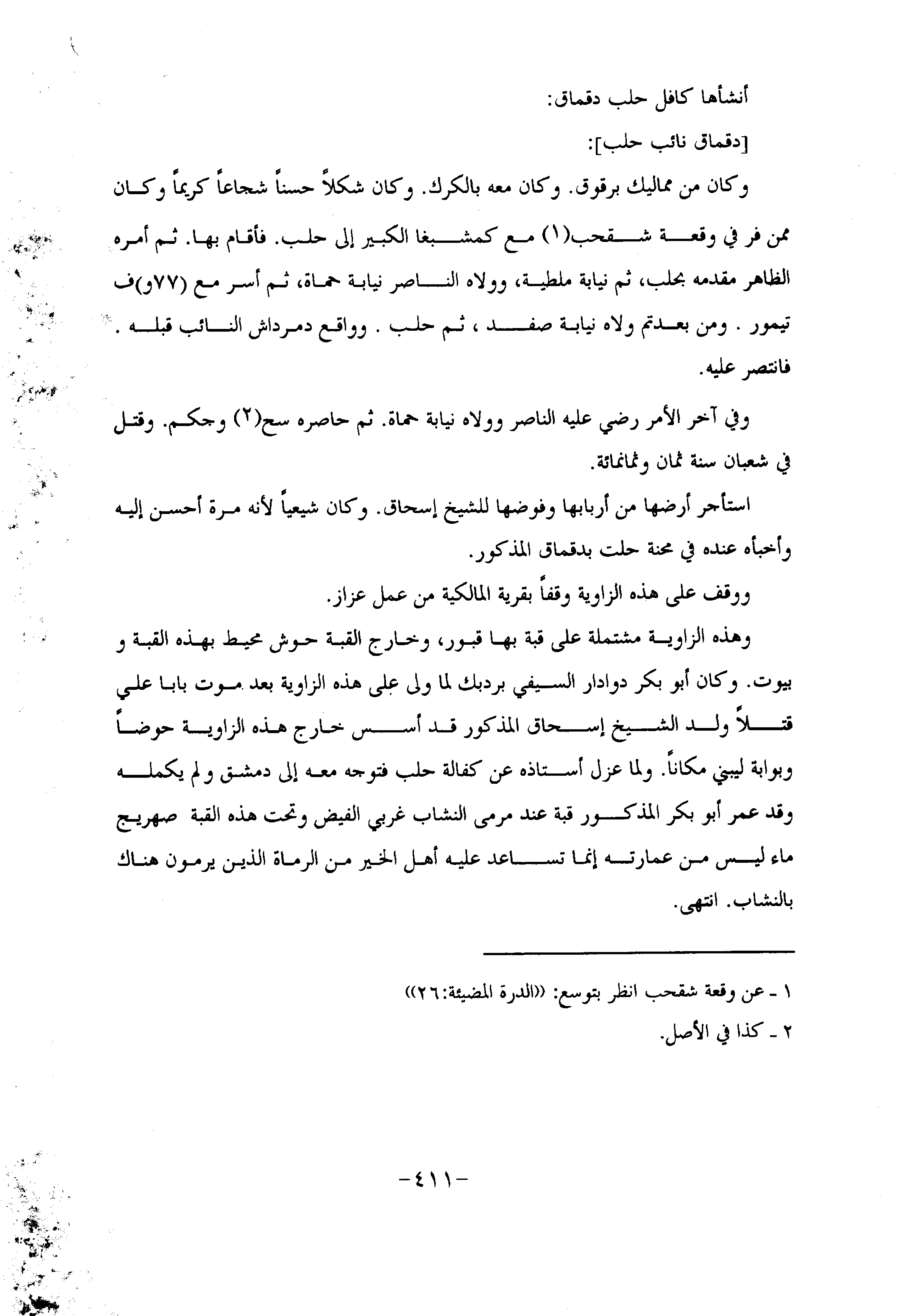 وكان من مماليك برقوق. وكان معه بالكرك. وكان شكلا حسنا شجاعا كريما وكان ممن فر في وقعة شقحب «1» مع كمشبغا الكبير إلى حلب. فأقام بها. ثم أمره الظاهر مقدمه بحلب، ثم نيابة ملطية، وولاه الناصر نيابة حماة، ثم أسر مع (77 و) ف تيمور. ومن بعدتم ولاه نيابة صفد، ثم حلب. وواقع دمرداش النائب قبله.