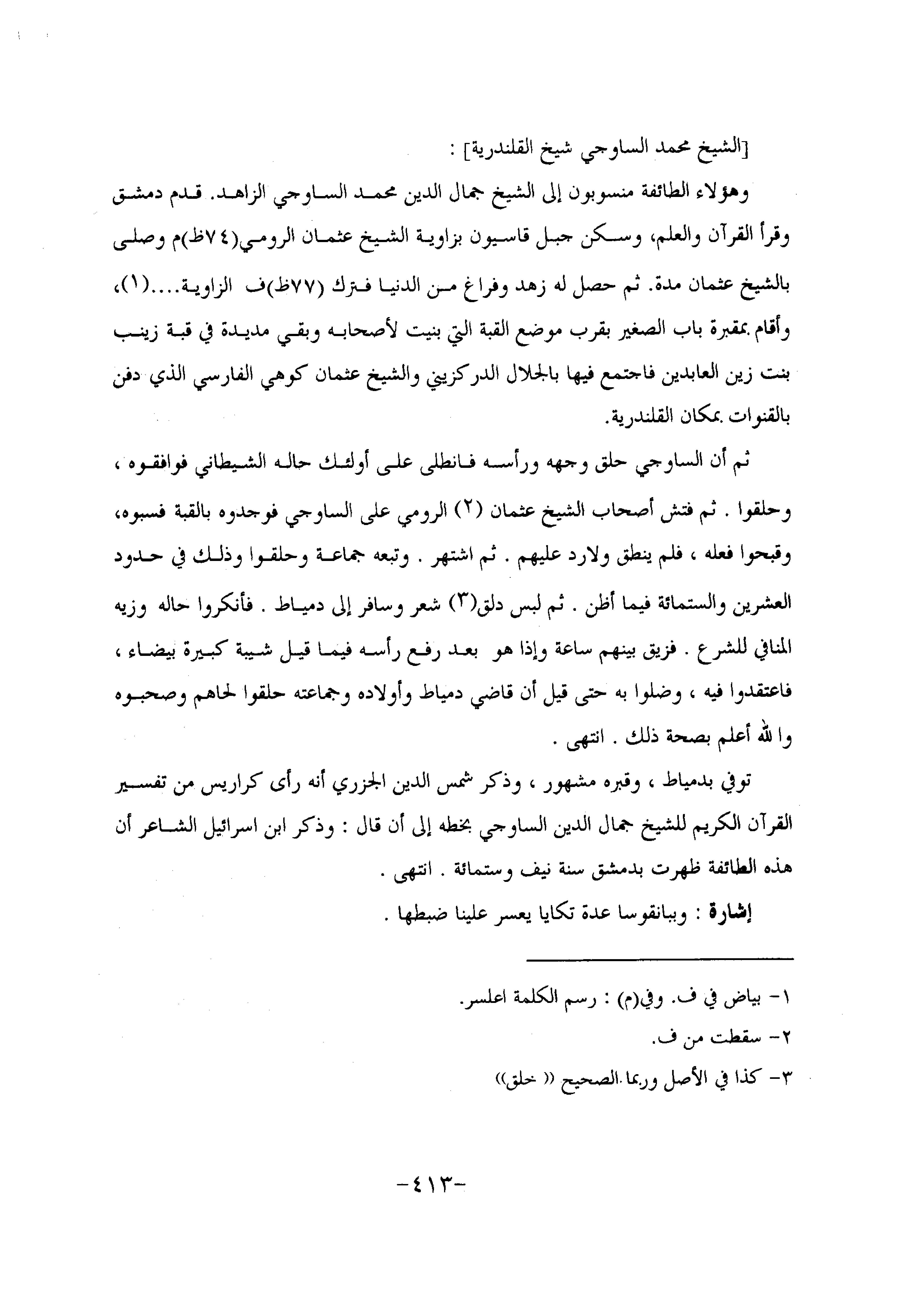 وهؤلاء الطائفة منسوبون إلى الشيخ جمال الدين محمد الساوجي الزاهد. قدم دمشق وقرأ القرآن والعلم، وسكن جبل قاسيون بزاوية الشيخ عثمان الرومي (74 ظ) م وصلى بالشيخ عثمان مدة. ثم حصل له زهد وفراغ من الدنيا فترك (77 ظ) ف الزاوية.... «1» ،