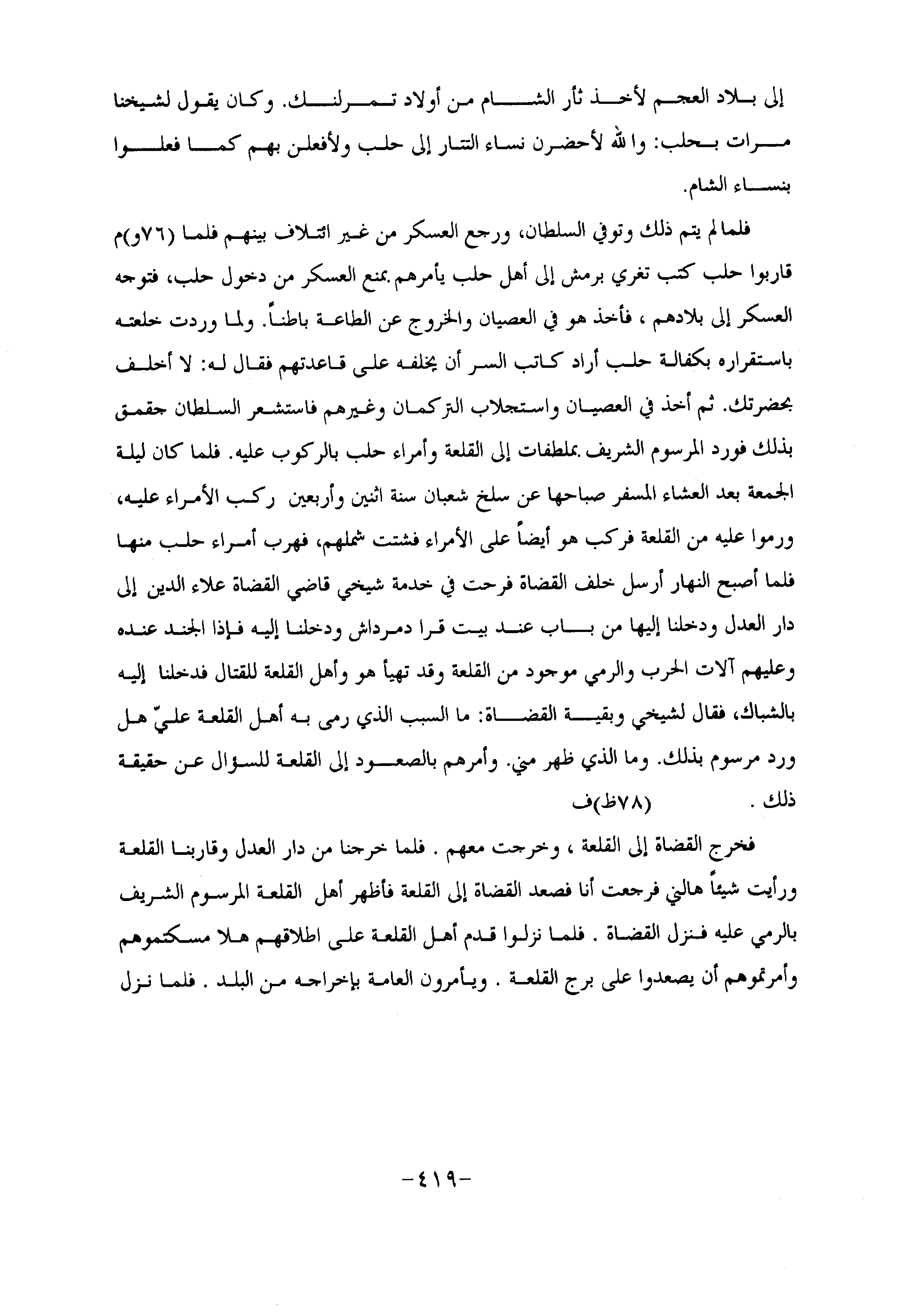 إلى بلاد العجم لأخذ ثأر الشام من أولاد تمر لنك. وكان يقول لشيخنا مرات بحلب: والله لأحضرن نساء التتار إلى حلب ولأفعلن بهم كما فعلوا بنساء الشام.