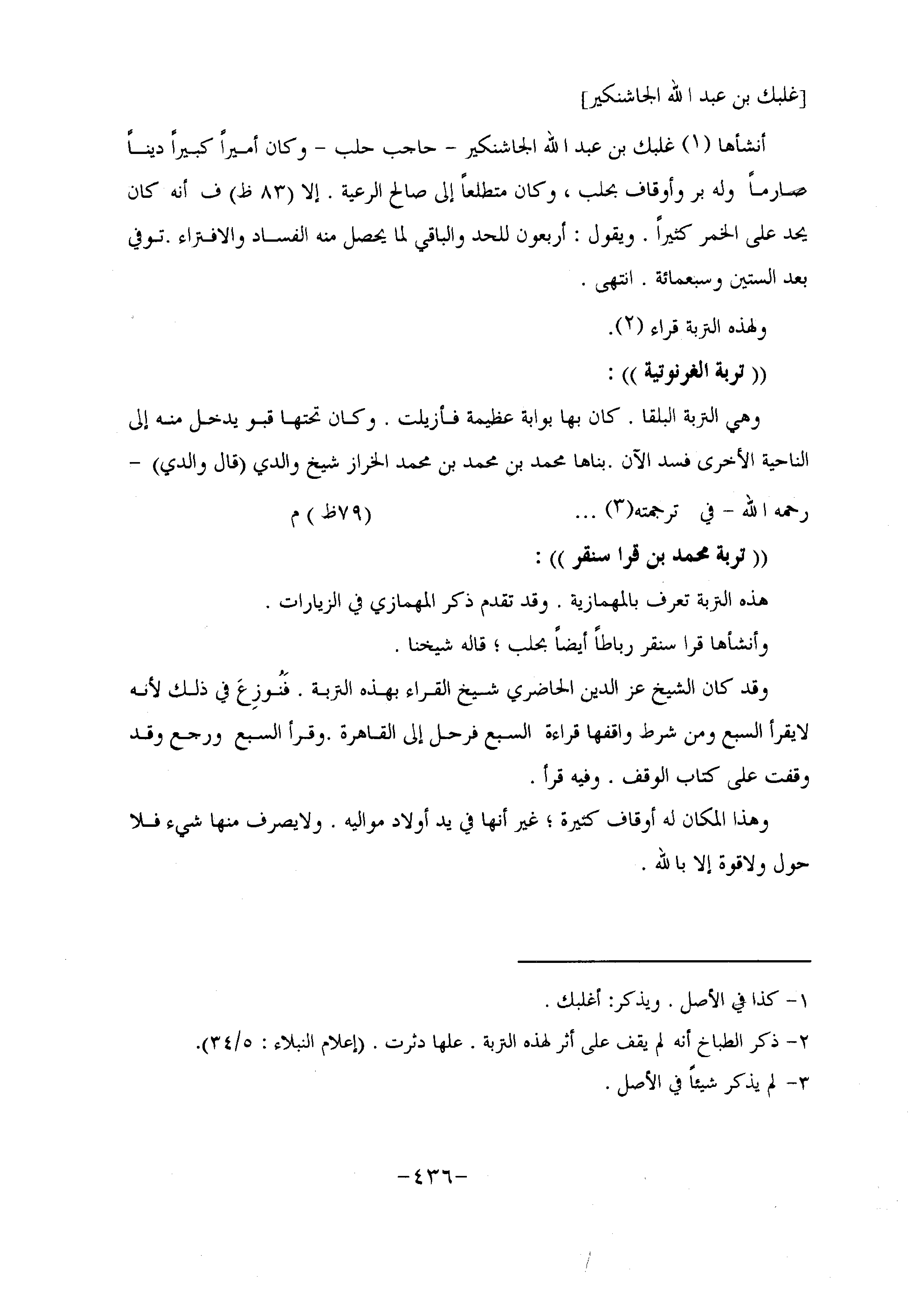 أنشأها «1» غلبك بن عبد الله الجاشنكير- حاجب حلب- وكان أميرا كبيرا دينا صارما وله بر وأوقاف بحلب، وكان متطلعا إلى صالح الرعية. إلا (83 ظ) ف أنه كان يحد على الخمر كثيرا. ويقول: أربعون للحد والباقي لما يحصل منه الفساد والافتراء. توفي بعد الستين وسبعمائة. انتهى.