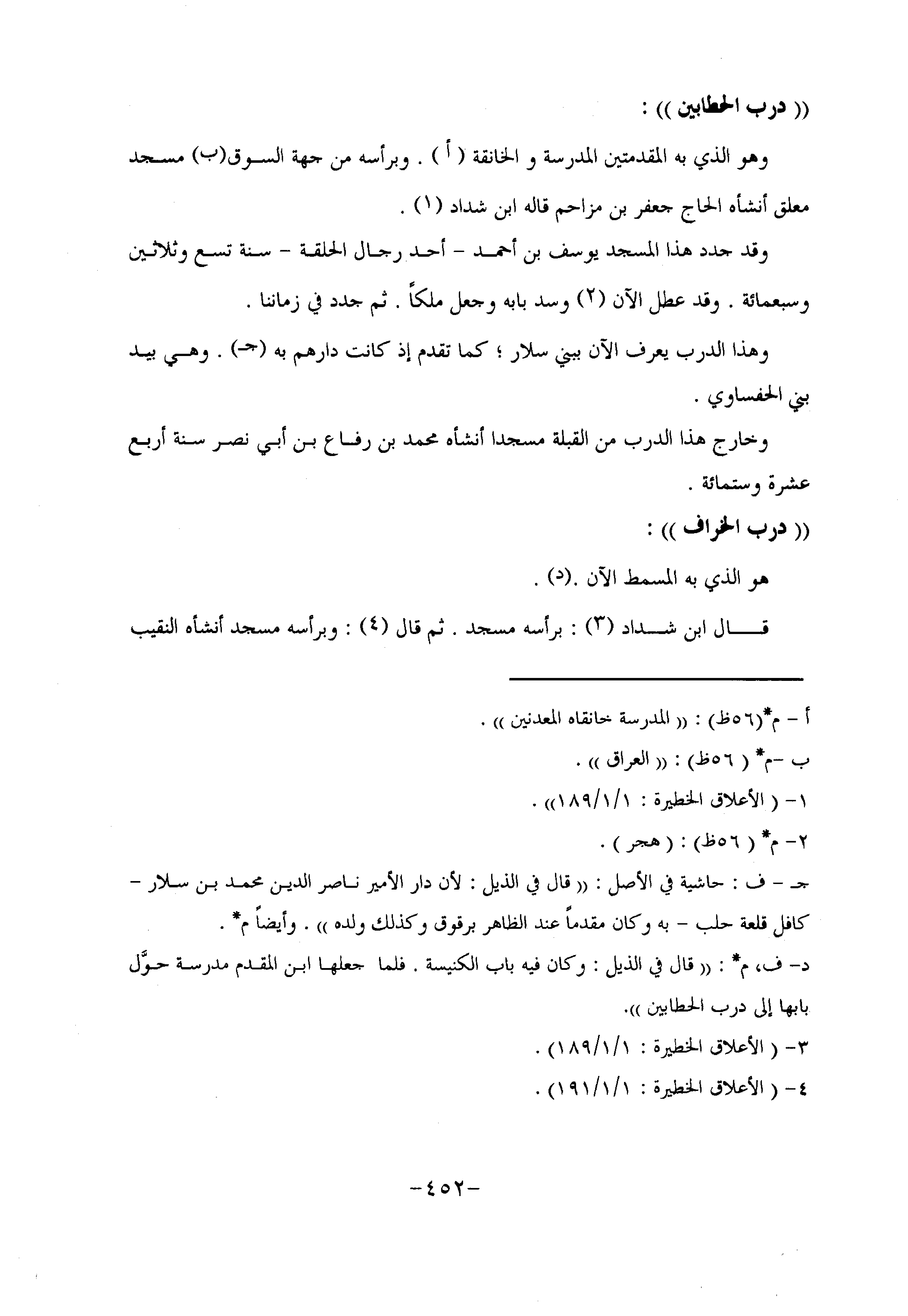وهو الذي به المقدمتين المدرسة والخانقة أ. وبرأسه من جهة السوق ب مسجد معلق أنشأه الحاج جعفر بن مزاحم قاله ابن شداد «1» .