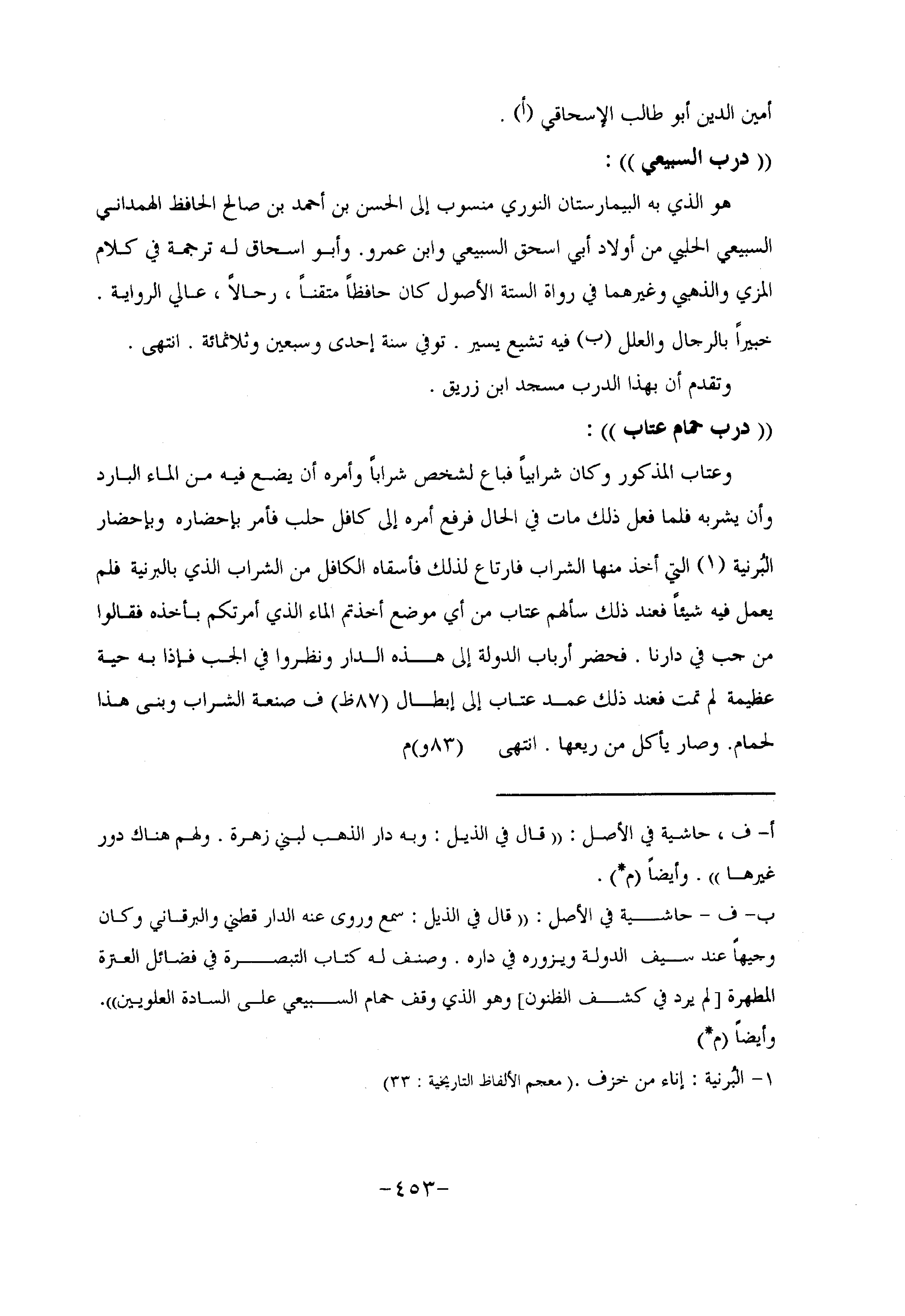 هو الذي به البيمارستان النوري منسوب إلى الحسن بن أحمد بن صالح الحافظ الهمداني السبيعي الحلبي من أولاد أبي اسحاق السبيعي وابن عمرو. وأبو اسحاق له ترجمة في كلام المزي والذهبي وغيرهما في رواة الستة الأصول كان حافظا متقنا، رحالا، عالي الرواية.