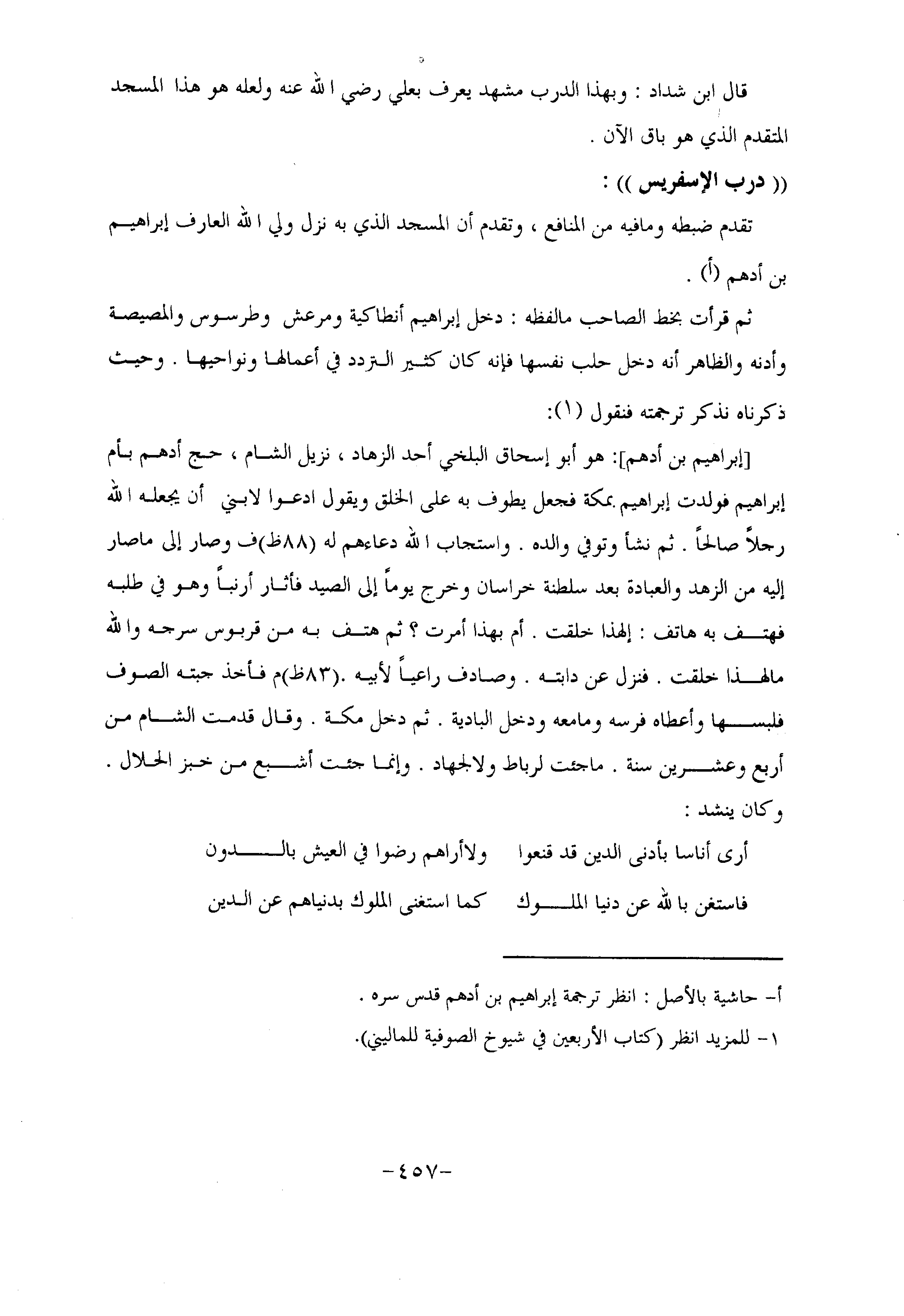[إبراهيم بن أدهم] : هو أبو إسحاق البلخي أحد الزهاد، نزيل الشام، حج أدهم بأم إبراهيم فولدت إبراهيم بمكة فجعل يطوف به على الخلق ويقول ادعوا لابني أن يجعله الله رجلا صالحا. ثم نشأ وتوفي والده. واستجاب الله دعاءهم له (88 ظ) ف وصار إلى ما صار إليه من الزهد والعبادة بعد سلطنة خراسان وخرج يوما إلى الصيد فأثار أرنبا وهو في طلبه فهتف به هاتف: ألهذا خلقت. أم بهذا أمرت؟ ثم هتف به من قربوس سرجه والله ما لهذا خلقت. فنزل عن دابته. وصادف راعيا لأبيه. (83 ظ) م فأخذ جبته الصوف فلبسها وأعطاه فرسه ومامعه ودخل البادية. ثم دخل مكة. وقال قدمت الشام من أربع وعشرين سنة. ما جئت لرباط ولالجهاد. وإنما جئت أشبع من خبز الحلال.