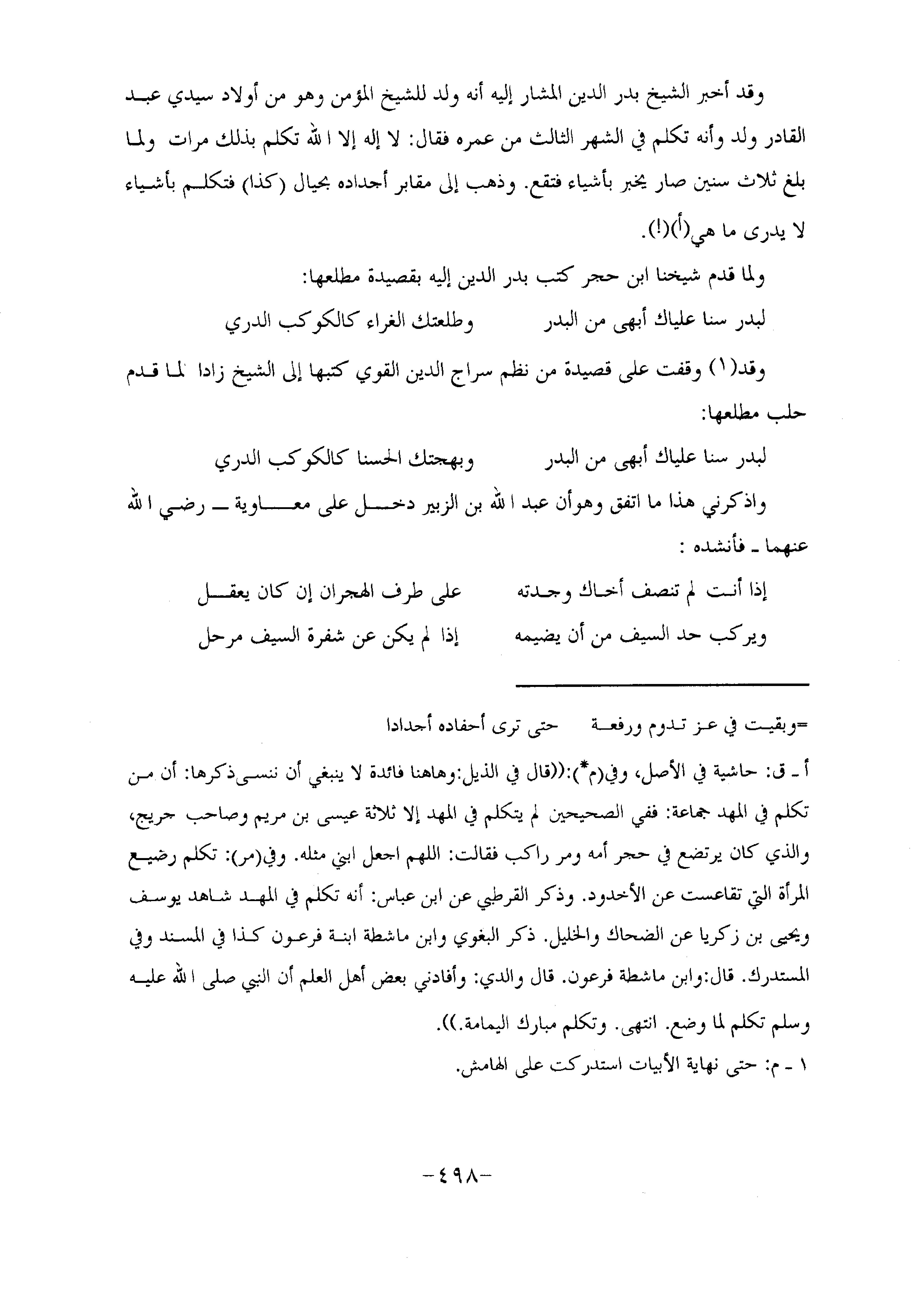 وقد أخبر الشيخ بدر الدين المشار إليه أنه ولد للشيخ المؤمن وهو من أولاد سيدي عبد القادر ولد وأنه تكلم في الشهر الثالث من عمره فقال: لا إله إلا الله تكلم بذلك مرات ولما بلغ ثلاث سنين صار يخبر بأشياء فتقع. وذهب إلى مقابر أجداده بحيال (كذا) فتكلم بأشياء لا يدرى ما هي أ (!) .