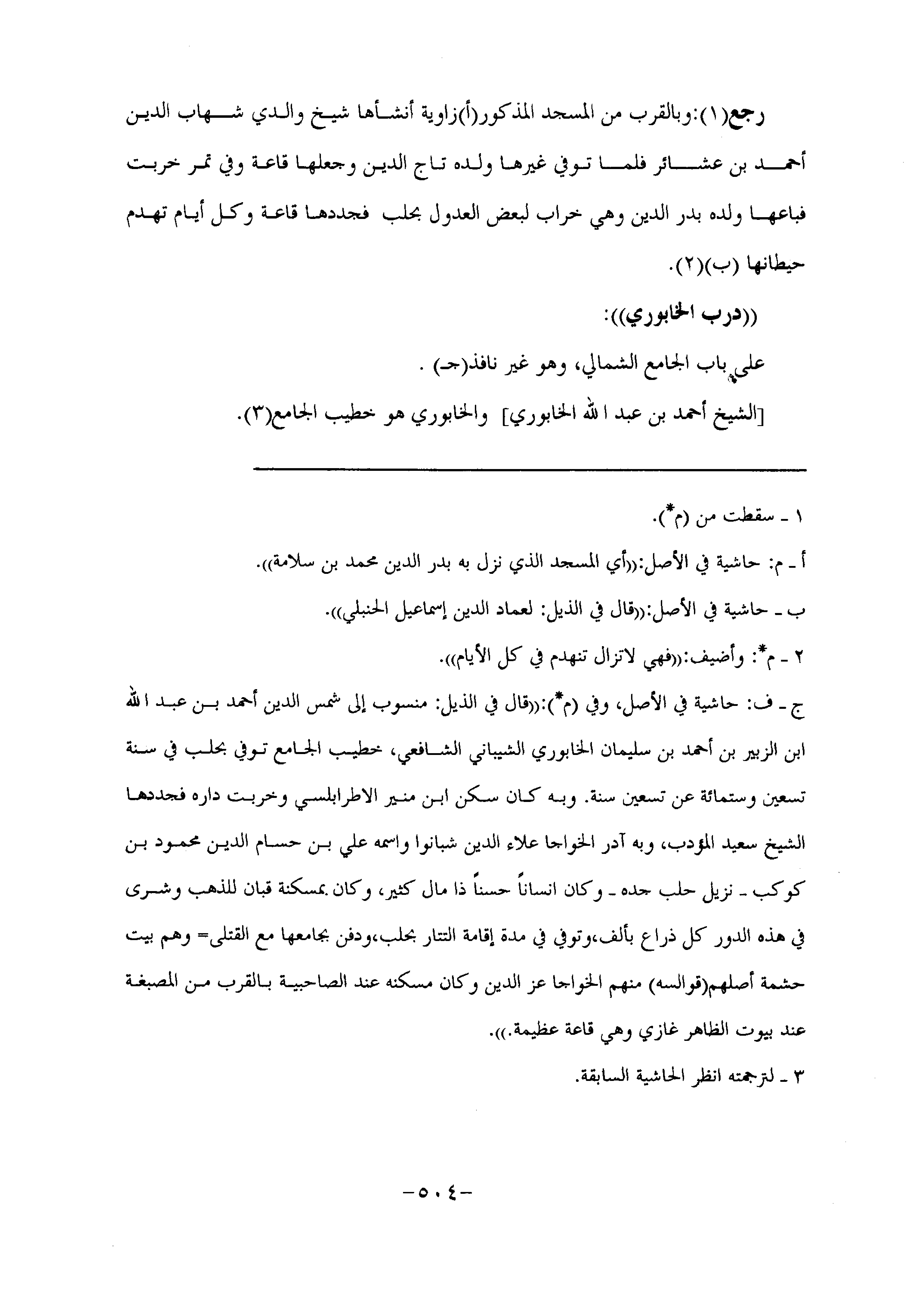 رجع «1» : وبالقرب من المسجد المذكور أزاوية أنشأها شيخ والدي شهاب الدين أحمد بن عشائر فلما توفي غيرها ولده تاج الدين وجعلها قاعة وفي تمر خربت فباعها ولده بدر الدين وهي خراب لبعض العدول بحلب فجددها قاعة وكل أيام تهدم حيطانها ب «2» .