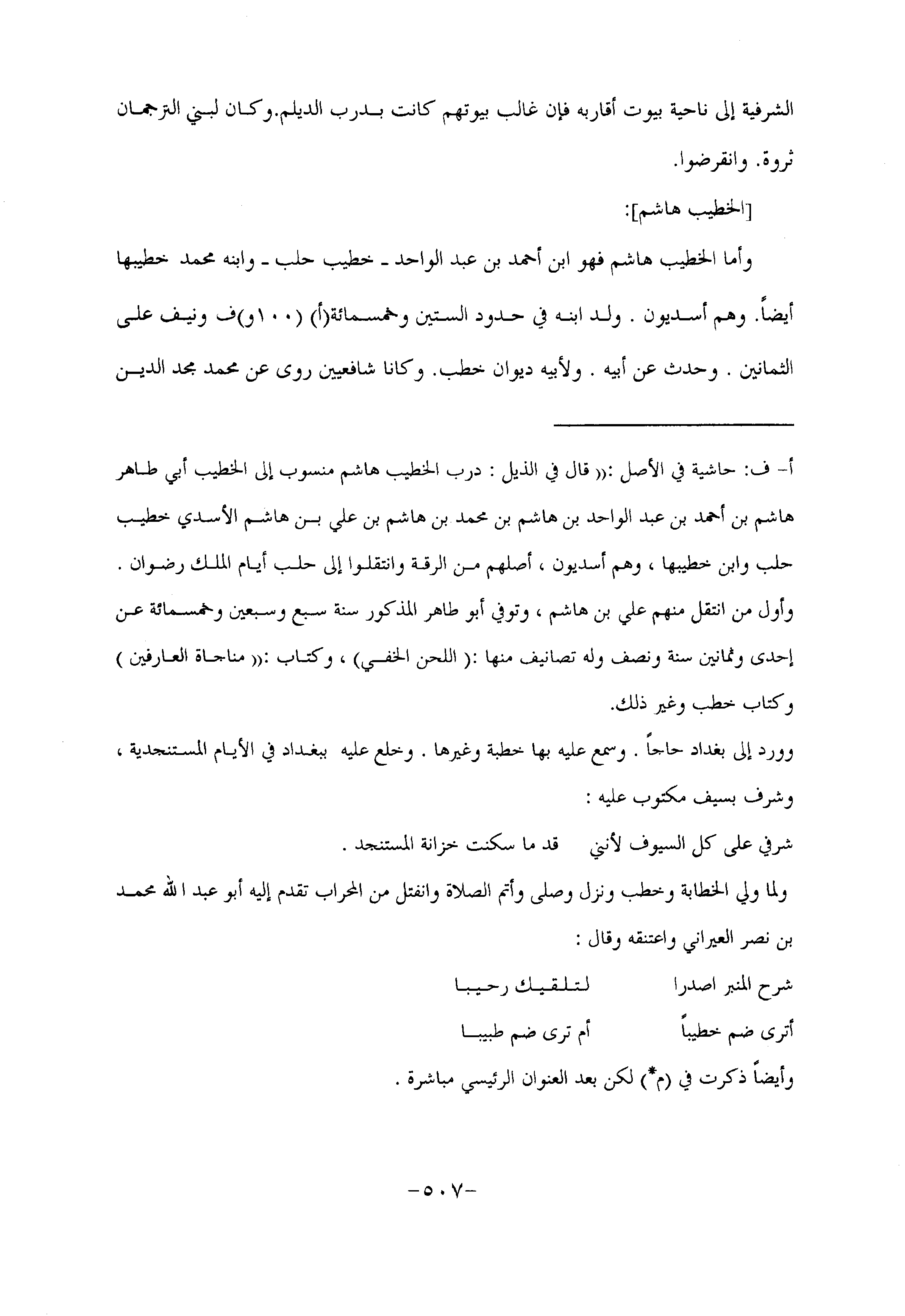 وأما الخطيب هاشم فهو ابن أحمد بن عبد الواحد- خطيب حلب- وابنه محمد خطيبها أيضا. وهم أسديون. ولد ابنه في حدود الستين وخمسمائة أ (100 و) ف ونيف على الثمانين. وحدث عن أبيه. ولأبيه ديوان خطب. وكانا شافعيين روى عن محمد مجد الدين