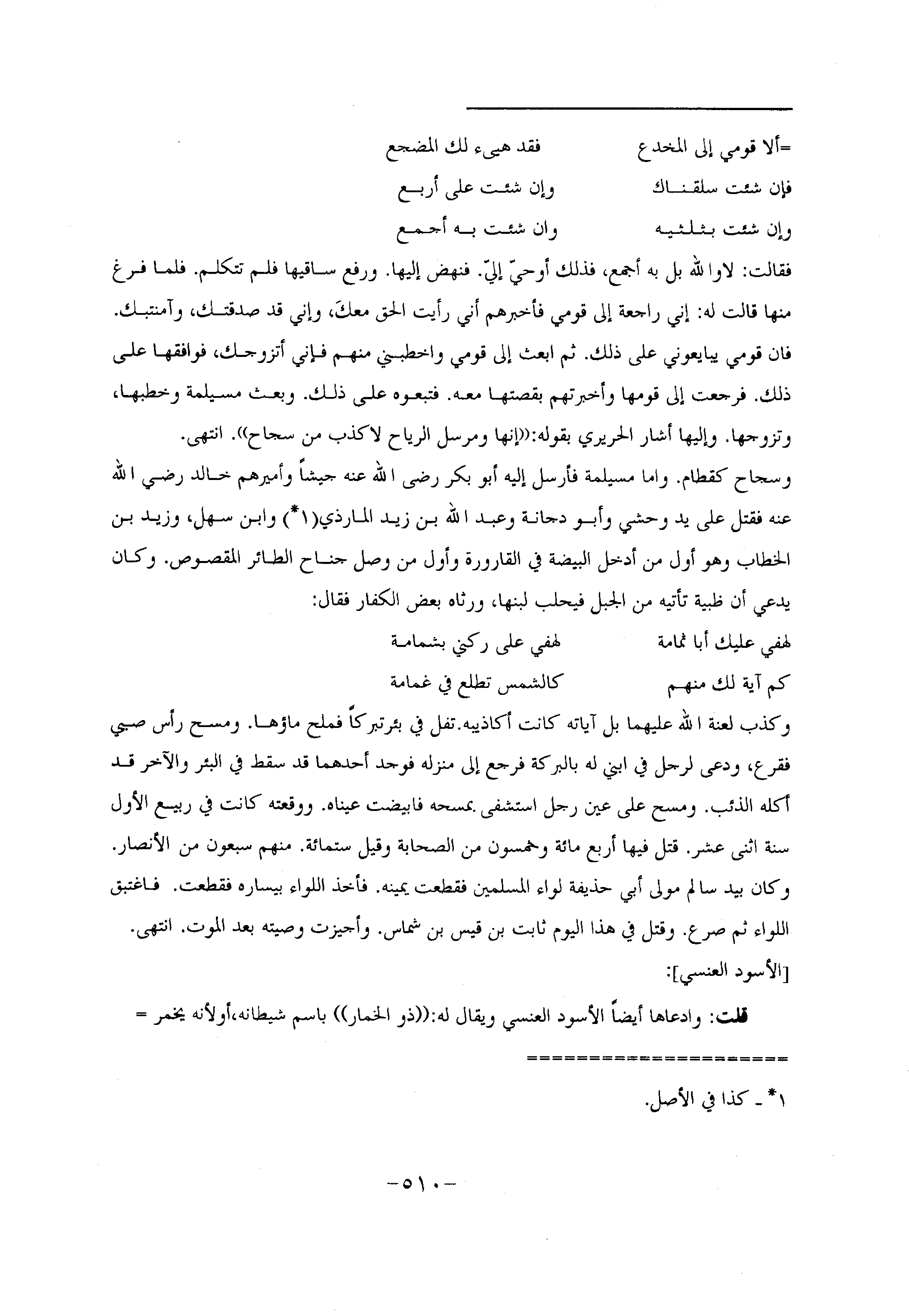 فان قومي يبايعوني على ذلك. ثم ابعث إلى قومي واخطبني منهم فإني أتزوجك، فوافقها على ذلك. فرجعت إلى قومها وأخبرتهم بقصتها معه. فتبعوه على ذلك. وبعث مسيلمة وخطبها، وتزوجها. وإليها أشار الحريري بقوله: «إنها ومرسل الرياح لا كذب من سجاح» . انتهى.