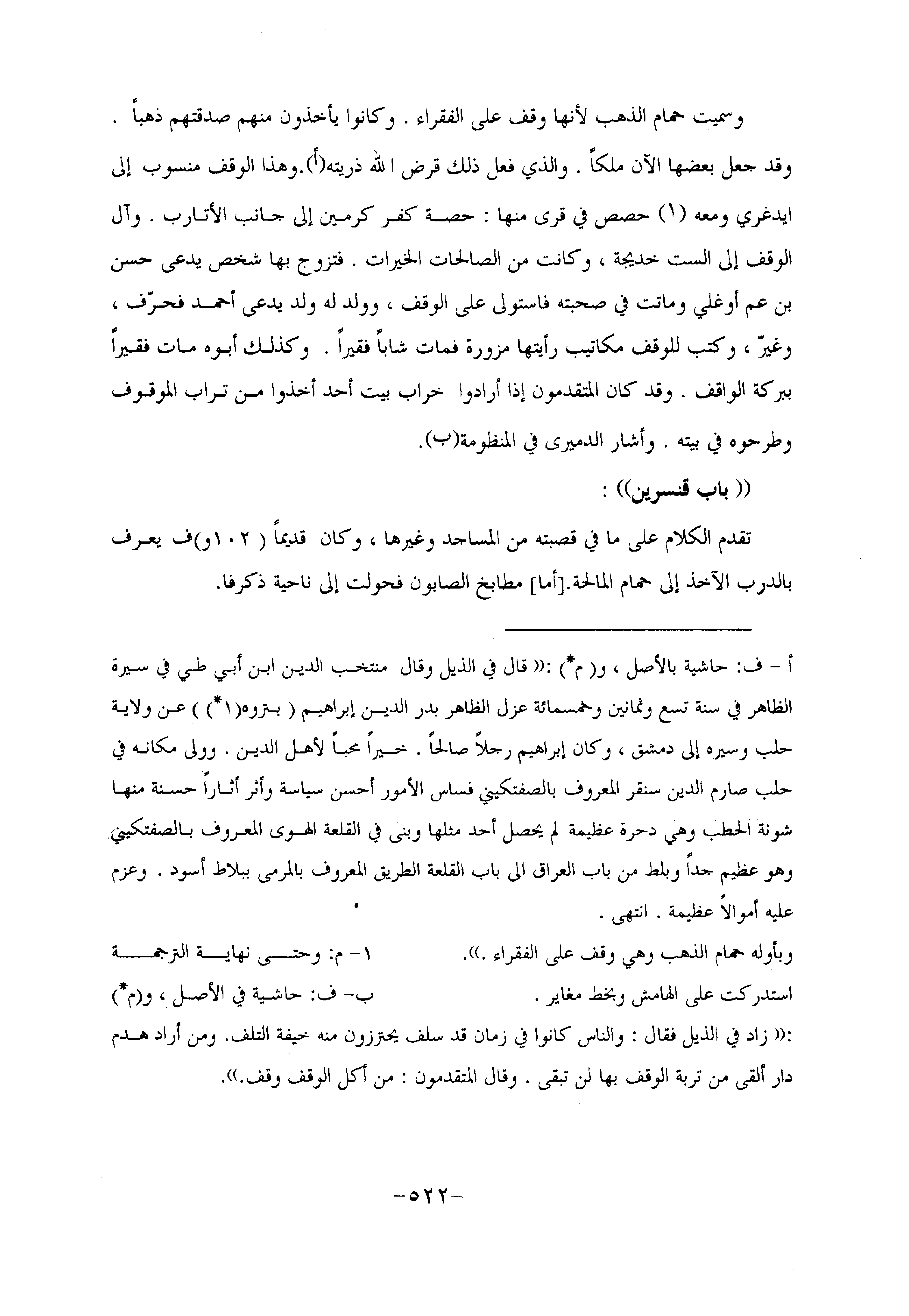 وقد جعل بعضها الآن ملكا. والذي فعل ذلك قرض الله ذريته [1] . وهذا الوقف منسوب إلى ايدغري ومعه «1» حصص في قرى منها: حصة كفر كرمين إلى جانب الأتارب. وآل الوقف إلى الست خديجة، وكانت من الصالحات الخيرات. فتزوج بها شخص يدعى حسن بن عم أوغلي وماتت في صحبة فاستولى على الوقف، وولد له ولد يدعى أحمد فحرّف، وغيّر، وكتب للوقف مكاتيب رأيتها مزورة فمات شابا فقيرا. وكذلك أبوه مات فقيرا ببركة الواقف. وقد كان المتقدمون إذا أرادوا خراب بيت أحد أخذوا من تراب الموقوف وطرحوه في بيته. وأشار الدميرى في المنظومة ب.