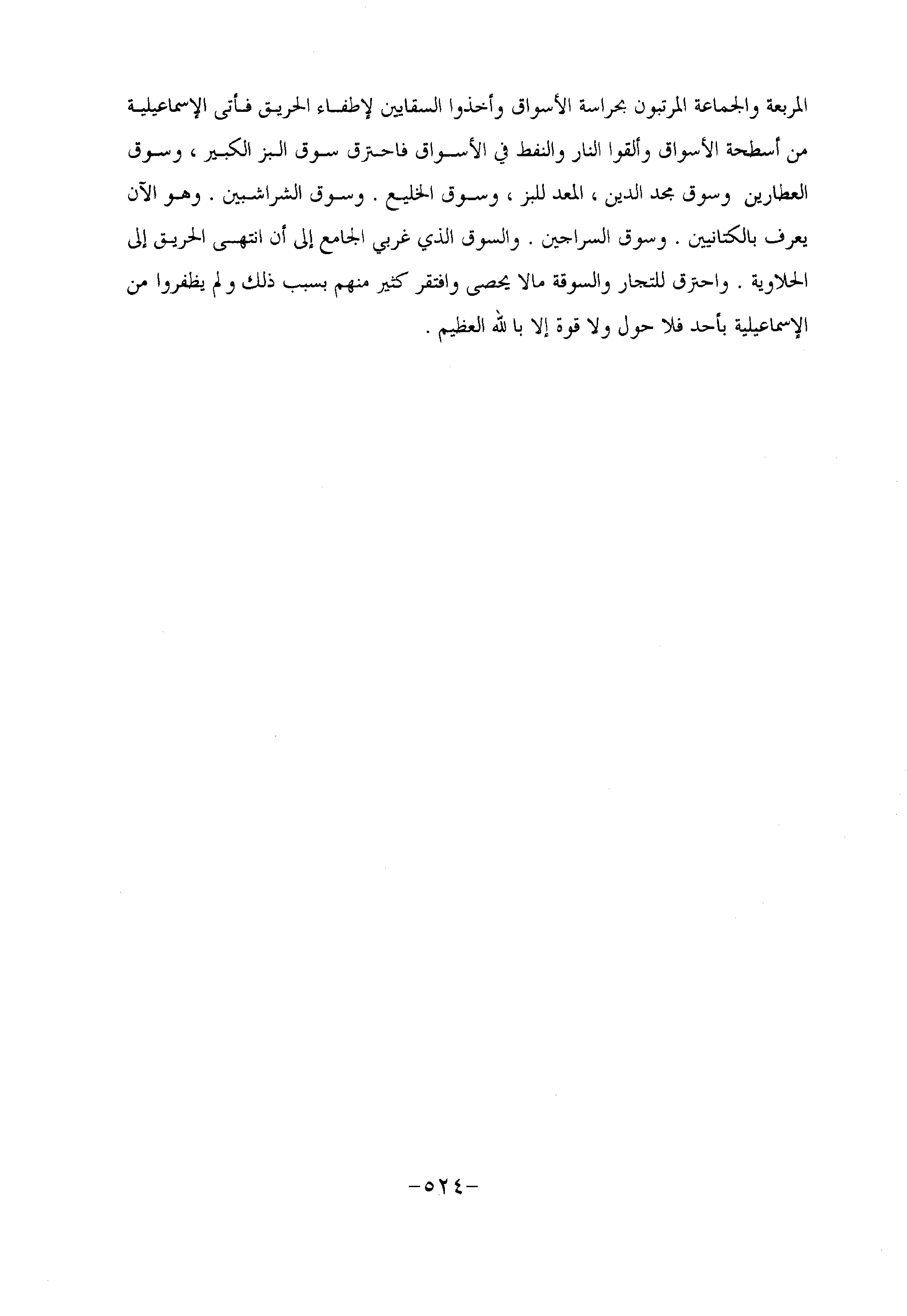 المربعة والجماعة المرتبون بحراسة الأسواق وأخذوا السقايين لإطفاء الحريق فأتى الإسماعيلية من أسطحة الأسواق وألقوا النار والنفط في الأسواق فاحترق سوق البز الكبير، وسوق العطارين وبالكتانيين. وسوق مجد الدين، المعد للبز، وسوق الخليع. وسوق الشراشبين. وهو الآن يعرف بالكتانيين. وسوق السراجين. والسوق الذي غربي الجامع إلى أن انتهى الحريق إلى الحلاوية. واحترق للتجار والسوقة ما لا يحصى وافتقر كثير منهم بسبب ذلك ولم يظفروا من الإسماعيلية بأحد فلا حول ولا قوة إلا بالله العظيم.