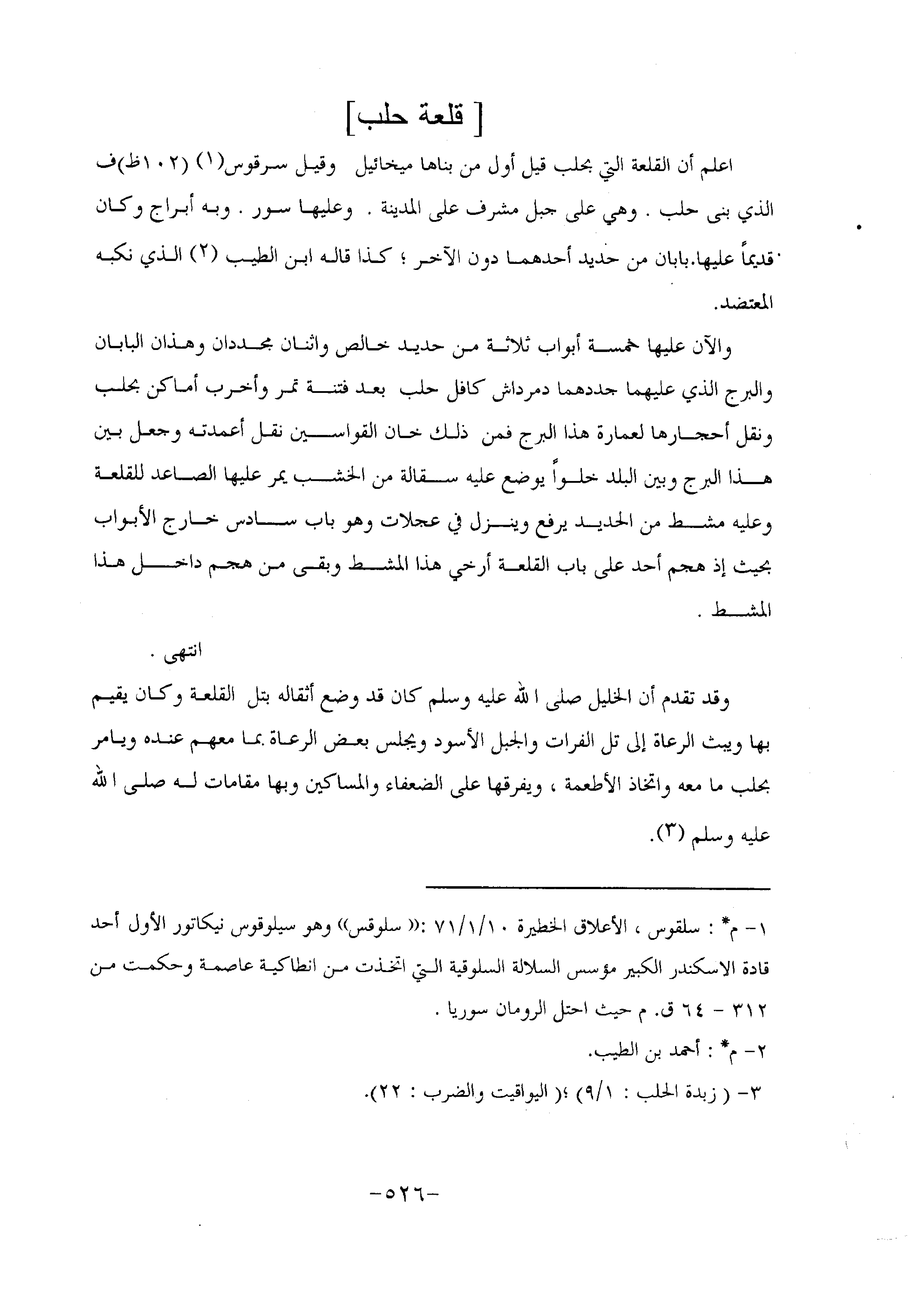 اعلم أن القلعة التي بحلب قيل أول من بناها ميخائيل وقيل سرقوس «1» (102 ظ) ف الذي بنى حلب. وهي على جبل مشرف على المدينة. وعليها سور. وبه أبراج وكان قديما عليها. بابان من حديد أحدهما دون الآخر؛ كذا قاله ابن الطيب «2» الذي نكبه المعتضد.