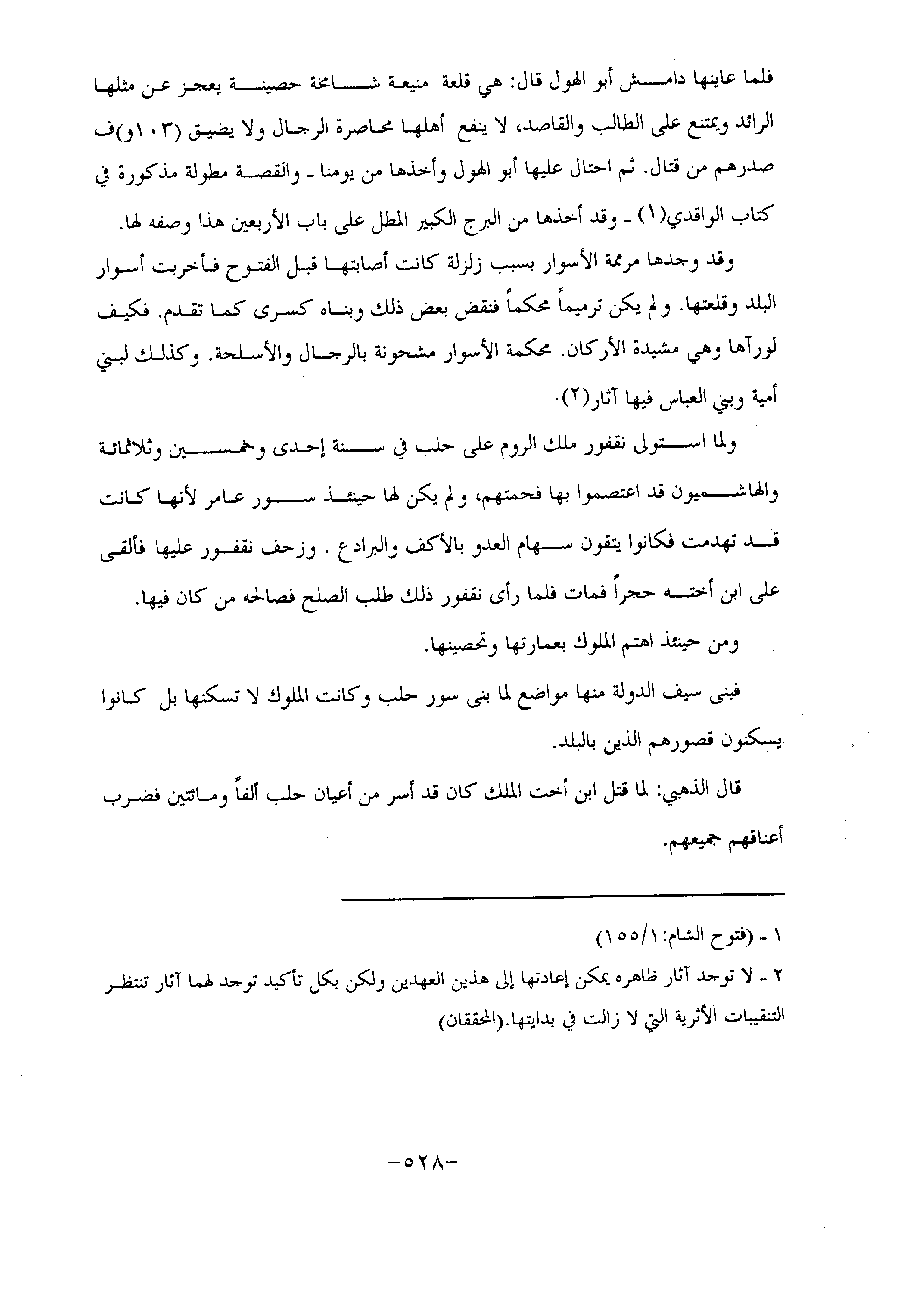 وقد وجدها مرممة الأسوار بسبب زلزلة كانت أصابتها قبل الفتوح فأخربت أسوار البلد وقلعتها. ولم يكن ترميما محكما فنقض بعض ذلك وبناه كسرى كما تقدم. فكيف لو رآها وهي مشيدة الأركان. محكمة الأسوار مشحونة بالرجال والأسلحة. وكذلك لبني أمية وبني العباس فيها آثار «2» .