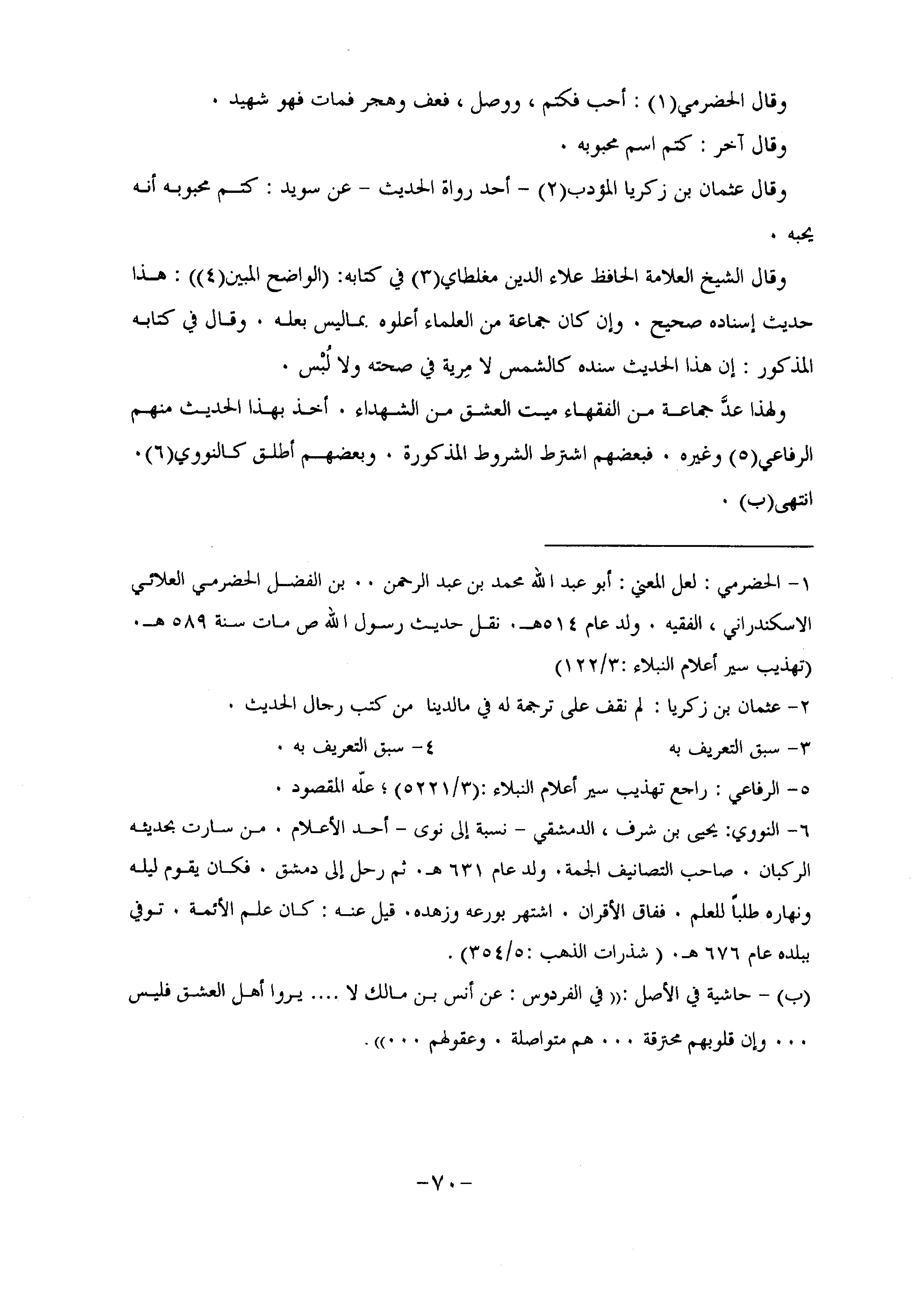 ولهذا عدّ جماعة من الفقهاء ميت العشق من الشهداء. أخذ بهذا الحديث منهم الرفاعي «5» وغيره. فبعضهم اشترط الشروط المذكورة. وبعضهم أطلق كالنووي «6» .