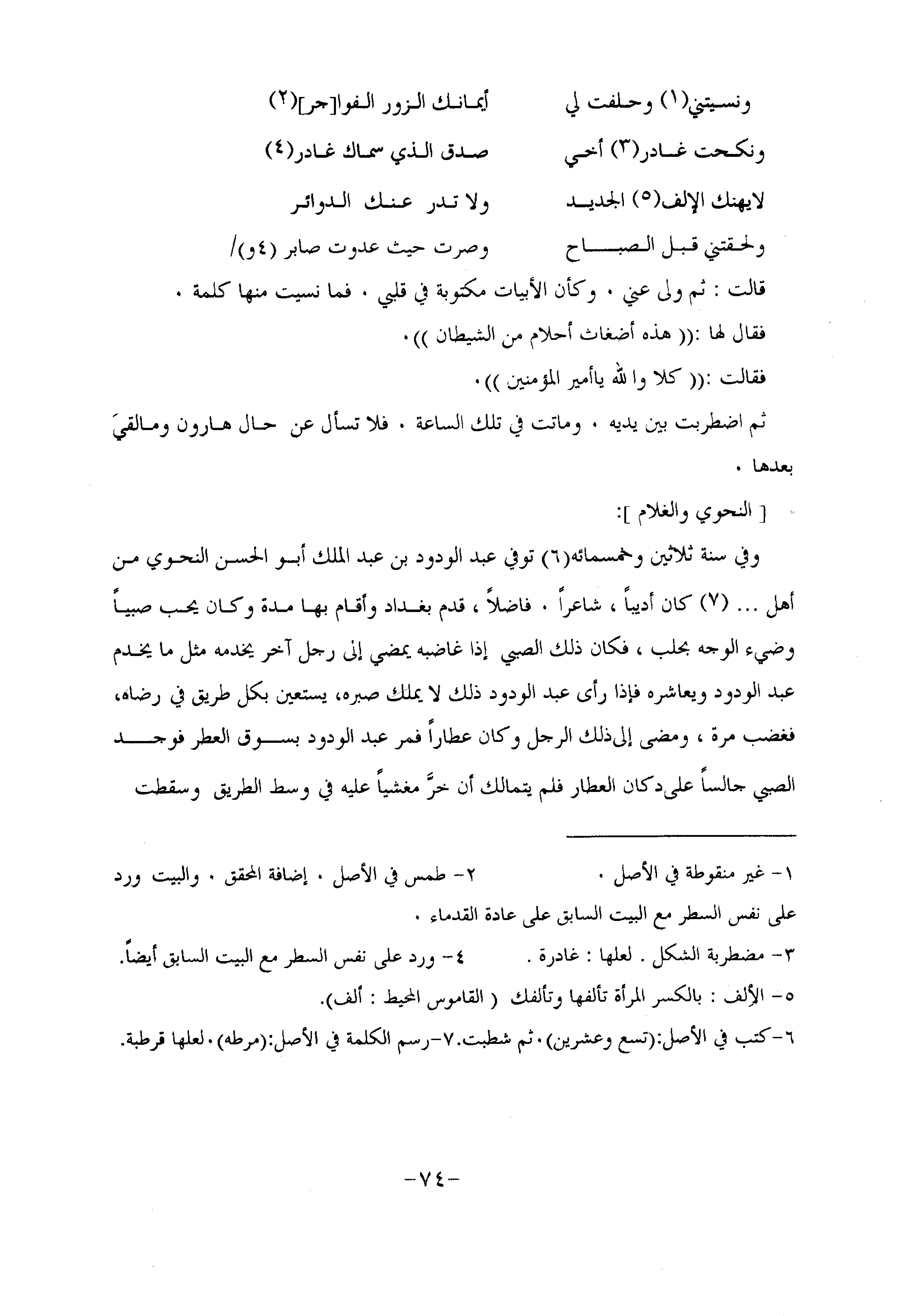 وفي سنة ثلاثين وخمسمائه «6» توفي عبد الودود بن عبد الملك أبو الحسن النحوي من أهل ... «7» كان أديبا، شاعرا. فاضلا، قدم بغداد وأقام بها مدة وكان يحب صبيا وضيء الوجه بحلب، فكان ذلك الصبي إذا غاضبه يمضي إلى رجل آخر يخدمه مثل ما يخدم عبد الودود ويعاشره فإذا رأى عبد الودود ذلك لا يملك صبره، يستعين بكل طريق في رضاه، فغضب مرة، ومضى إلى ذلك الرجل وكان عطارا فمر عبد الودود بسوق العطر فوجد الصبي جالسا على دكان العطار فلم يتمالك أن خرّ مغشيا عليه في وسط الطريق وسقطت