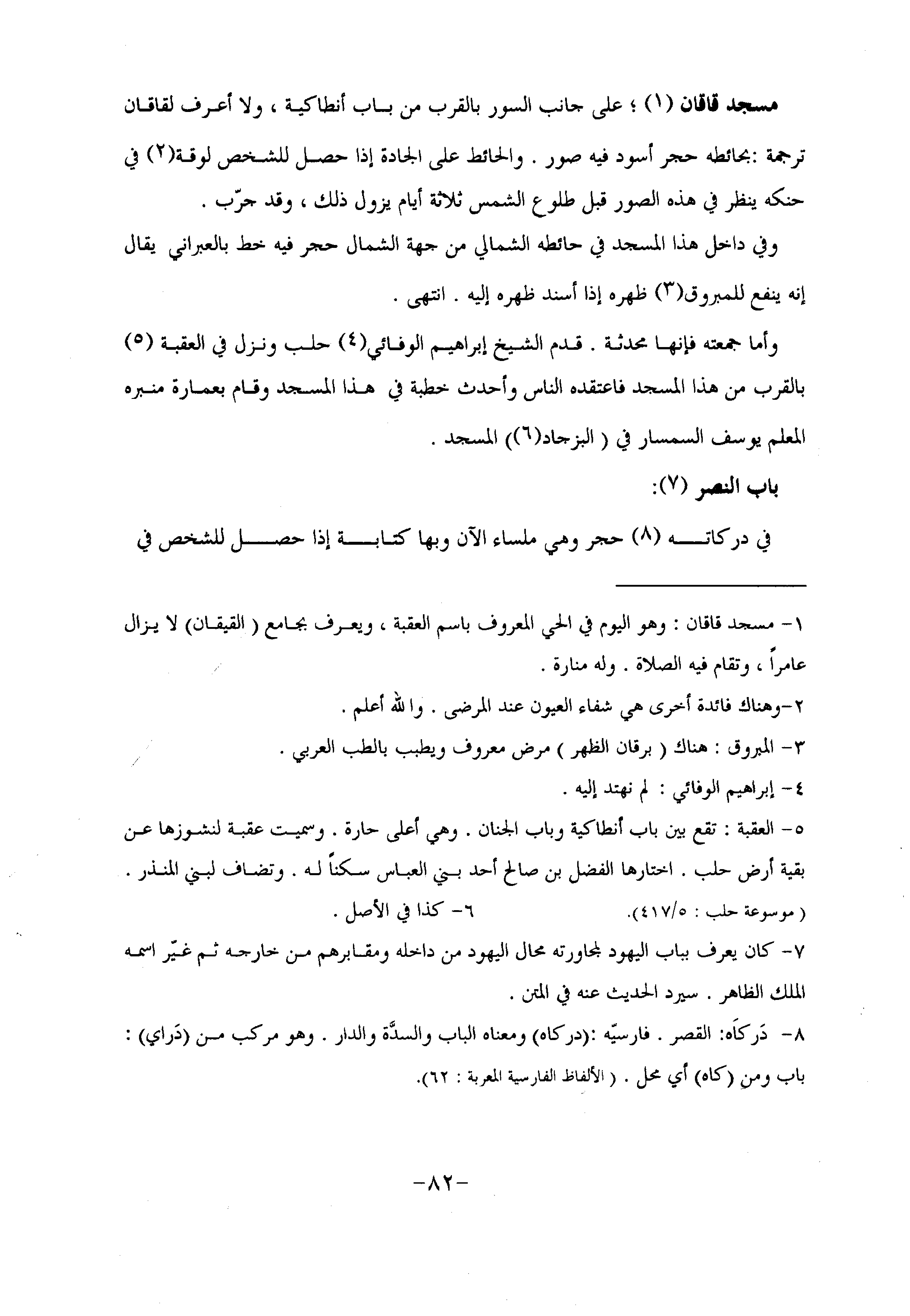 وأما جمعته فإنها محدثة. قدم الشيخ إبراهيم الوفائي «4» حلب ونزل في العقبة «5» بالقرب من هذا المسجد فاعتقده الناس وأحدث خطبة في هذا المسجد وقام بعمارة منبره المعلم يوسف السمسار في (البزجاد «6» ) المسجد.