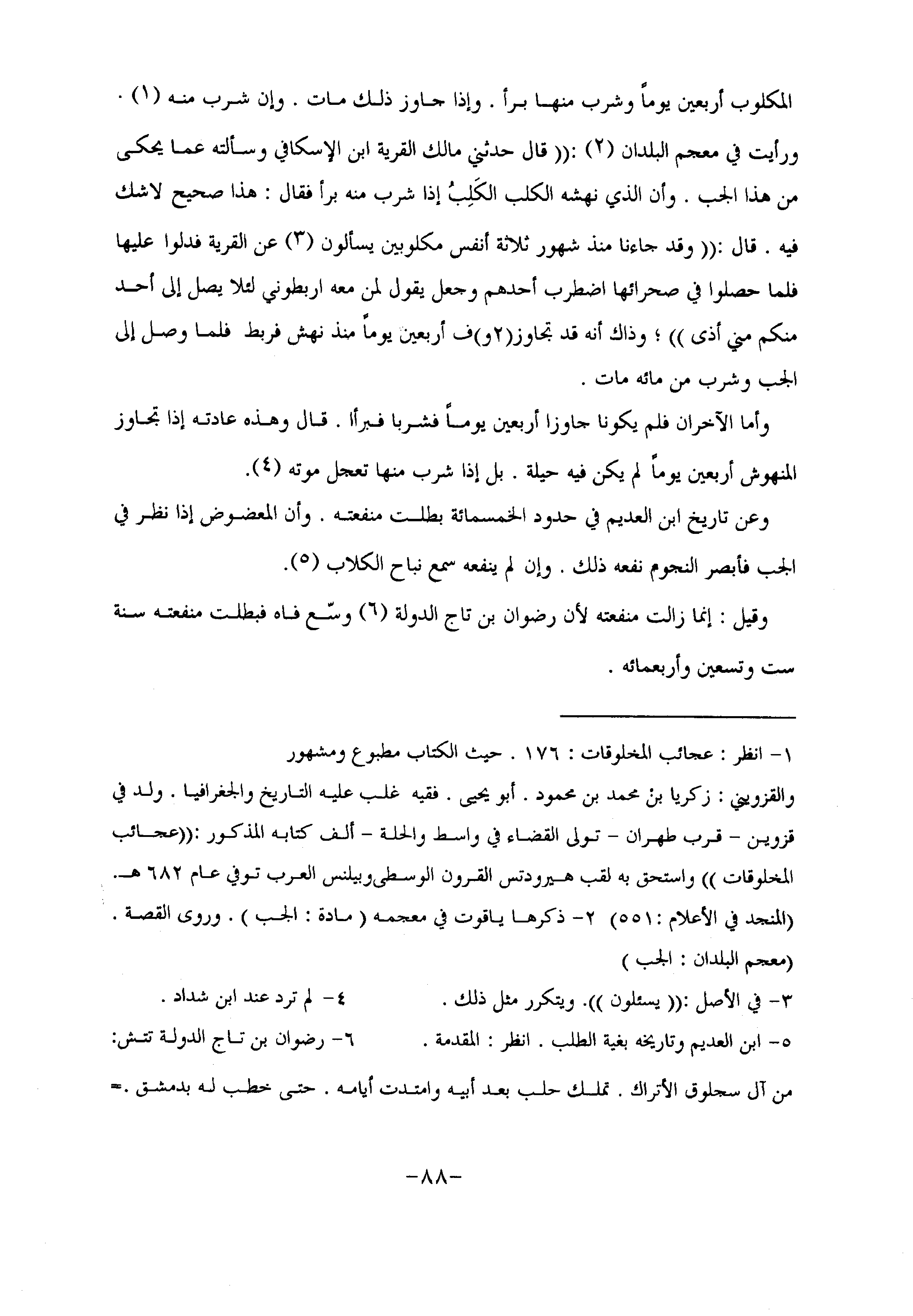ورأيت في معجم البلدان «2» : «قال حدثني مالك القرية ابن الإسكافي وسألته عما يحكى من هذا الجب. وأن الذي نهشه الكلب الكلب إذا شرب منه برأ فقال: هذا صحيح لا شك فيه. قال: «وقد جاءنا منذ شهور ثلاثة أنفس مكلوبين يسألون «3» عن القرية فدلوا عليها فلما حصلوا في صحرائها اضطرب أحدهم وجعل يقول لمن معه اربطوني لئلا يصل إلى أحد منكم مني أذى» ؛ وذاك أنه قد تجاوز (2 و) ف أربعين يوما منذ نهش فربط فلما وصل إلى الجب وشرب من مائه مات.