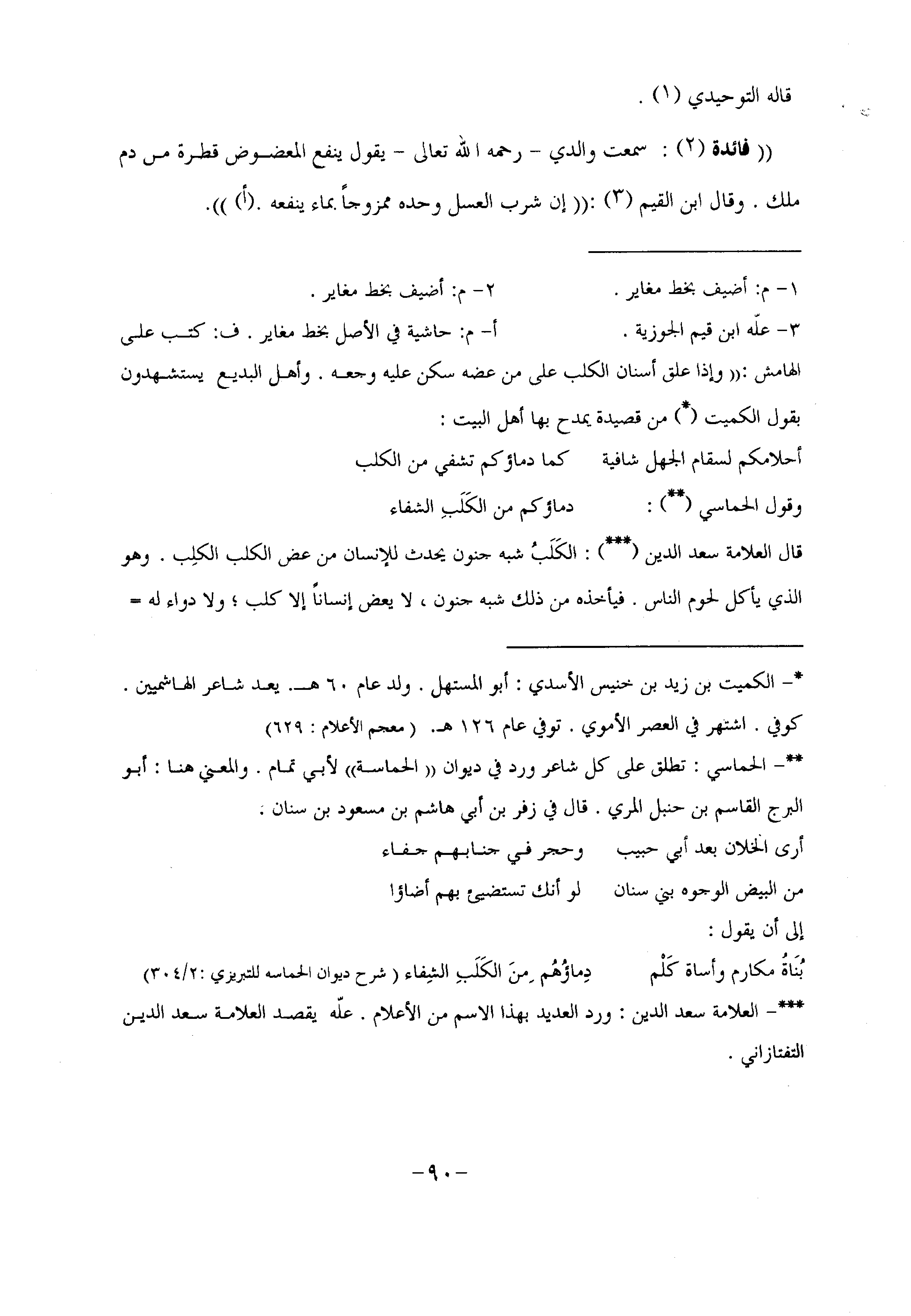 «فائدة «2» : سمعت والدي- رحمه الله تعالى- يقول ينفع المعضوض قطرة من دم ملك. وقال ابن القيم «3» : «إن شرب العسل وحده ممزوجا بماء ينفعه. أ» .