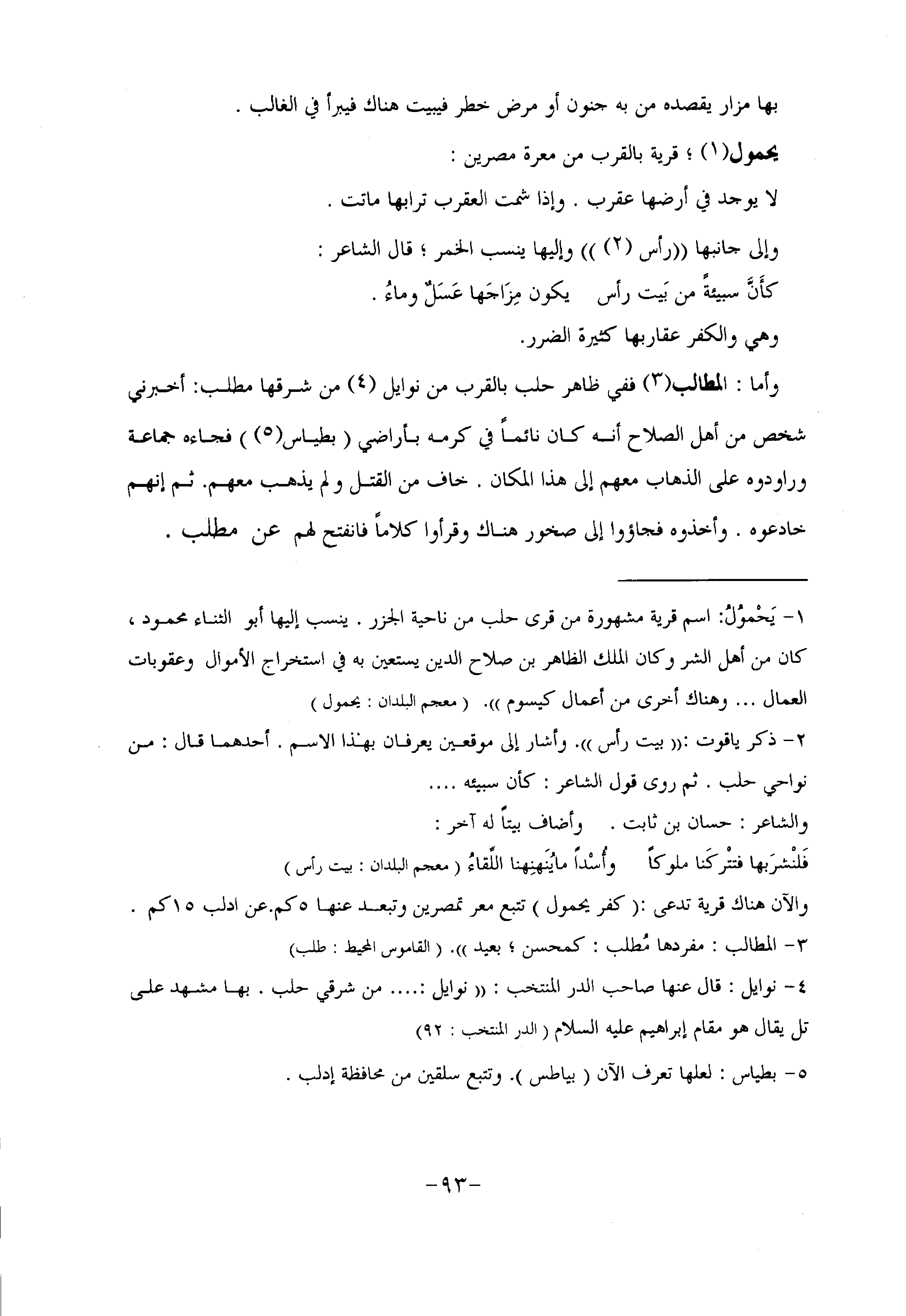 وأما: المطالب «3» ففي ظاهر حلب بالقرب من نوايل «4» من شرقها مطلب: أخبرني شخص من أهل الصلاح أنه كان نائما في كرمه بأراضي (بطياس «5» ) فجاءه جماعة وراودوه على الذهاب معهم إلى هذا المكان. خاف من القتل ولم يذهب معهم. ثم إنهم خادعوه. وأخذوه فجاؤوا إلى صخور هناك وقرأوا كلاما فانفتح لهم عن مطلب.