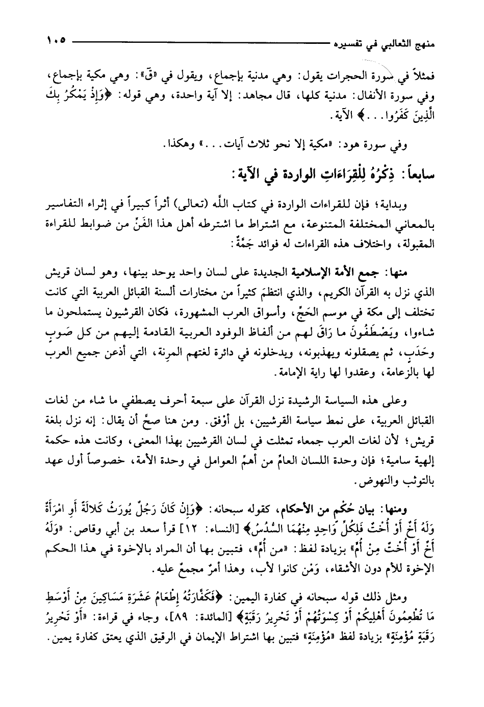 وعلى هذه السياسة الرشيدة نزل القرآن على سبعة أحرف يصطفي ما شاء من لغات القبائل العربية، على نمط سياسة القرشيين، بل أوفق. ومن هنا صحّ أن يقال: إنه نزل بلغة قريش لأن لغات العرب جمعاء تمثلت في لسان القرشيين بهذا المعنى، وكانت هذه حكمة إلهية سامية فإن وحدة اللسان العامّ من أهمّ العوامل في وحدة الأمة، خصوصا أول عهد بالتوثب والنهوض.