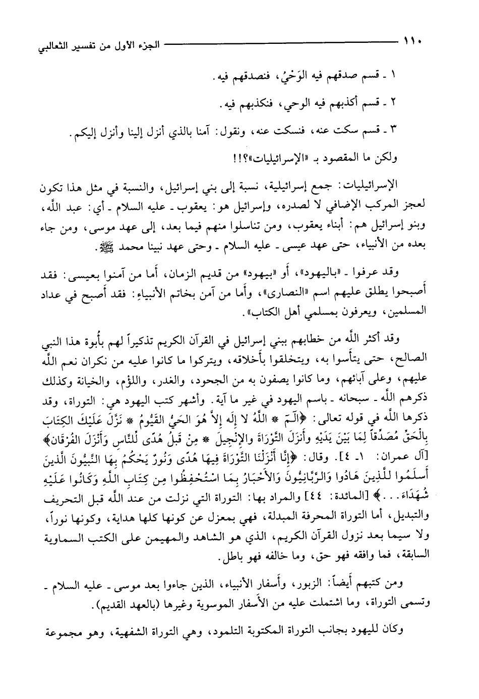 وقد أكثر الله من خطابهم ببني إسرائيل في القرآن الكريم تذكيرا لهم بأبوة هذا النبي الصالح، حتى يتأسوا به، ويتخلقوا بأخلاقه، ويتركوا ما كانوا عليه من نكران نعم الله عليهم، وعلى آبائهم، وما كانوا يصفون به من الجحود، والغدر، واللؤم، والخيانة وكذلك ذكرهم الله- سبحانه- باسم اليهود في غير ما آية. وأشهر كتب اليهود هي: التوراة، وقد ذكرها الله في قوله تعالى: الم اللَّهُ لاَ إِلهَ إِلَّا هُوَ الْحَيُّ الْقَيُّومُ نَزَّلَ عَلَيْكَ الْكِتابَ بِالْحَقِّ مُصَدِّقاً لِما بَيْنَ يَدَيْهِ وَأَنْزَلَ التَّوْراةَ وَالْإِنْجِيلَ مِنْ قَبْلُ هُدىً لِلنَّاسِ وَأَنْزَلَ الْفُرْقانَ [آل عمران: 1- 4] . وقال: إِنَّا أَنْزَلْنَا التَّوْراةَ فِيها هُدىً وَنُورٌ يَحْكُمُ بِهَا النَّبِيُّونَ الَّذِينَ أَسْلَمُوا لِلَّذِينَ هادُوا وَالرَّبَّانِيُّونَ وَالْأَحْبارُ بِمَا اسْتُحْفِظُوا مِنْ كِتابِ اللَّهِ وَكانُوا عَلَيْهِ شُهَداءَ ... [المائدة: 44] والمراد بها: التوراة التي نزلت من عند الله قبل التحريف والتبديل، أما التوراة المحرفة المبدلة، فهي بمعزل عن كونها كلها هداية، وكونها نورا، ولا سيما بعد نزول القرآن الكريم، الذي هو الشاهد والمهيمن على الكتب السماوية السابقة، فما وافقه فهو حق، وما خالفه فهو باطل.