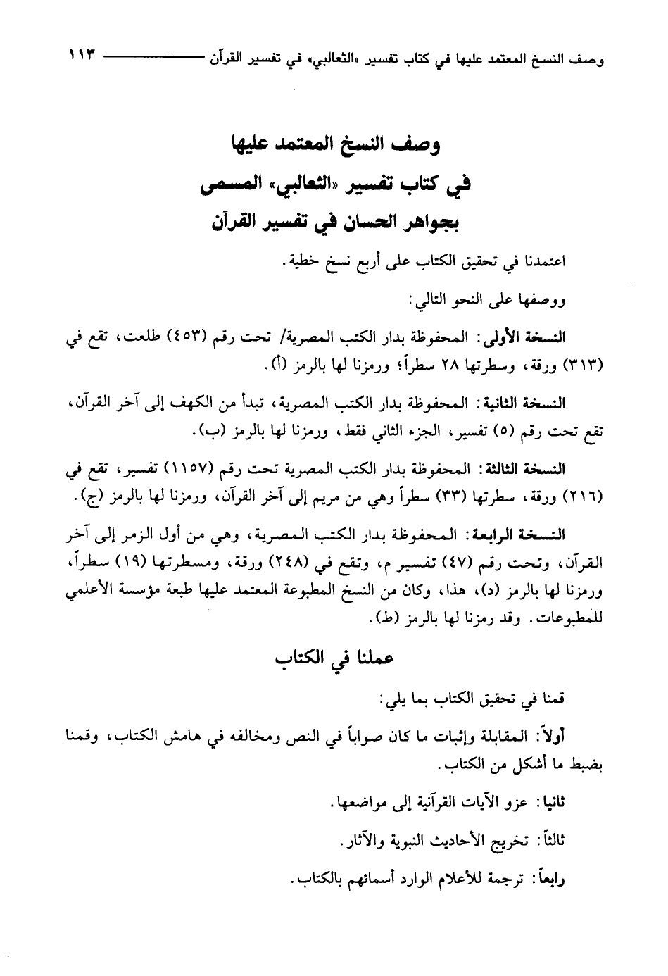 وصف النسخ المعتمد عليها في كتاب تفسير «الثعالبي» المسمى بجواهر الحسان في تفسير القرآن