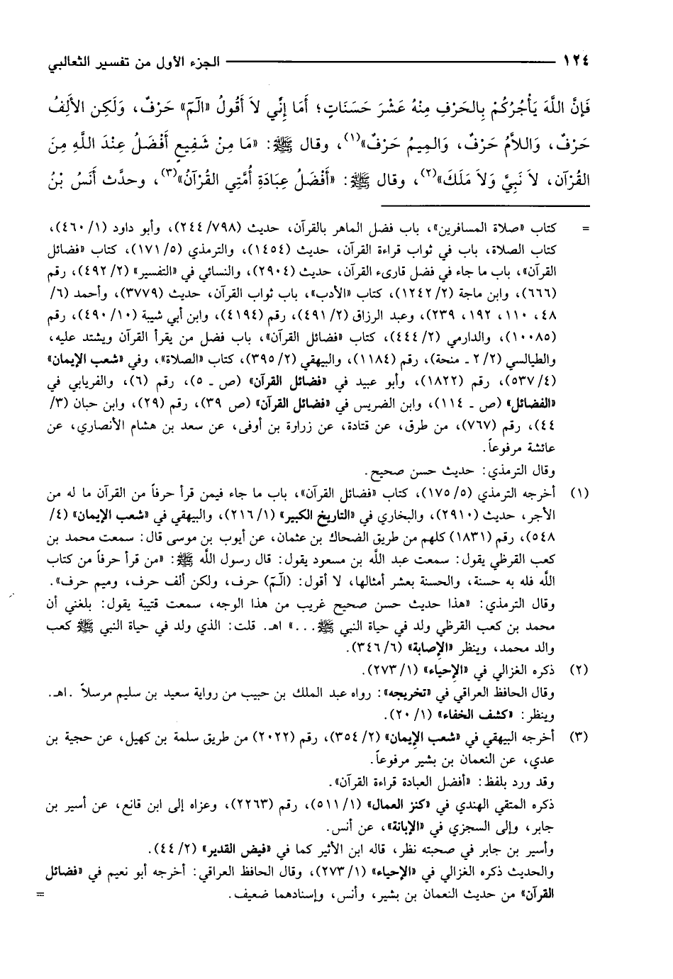 (1) أخرجه الترمذي (5/ 175) ، كتاب «فضائل القرآن» ، باب ما جاء فيمن قرأ حرفا من القرآن ما له من الأجر، حديث (2910) ، والبخاري في «التاريخ الكبير» (1/ 216) ، والبيهقي في «شعب الإيمان» (4/ 548) ، رقم (1831) كلهم من طريق الضحاك بن عثمان، عن أيوب بن موسى قال: سمعت محمد بن كعب القرظي يقول: سمعت عبد الله بن مسعود يقول: قال رسول الله صلى الله عليه وسلم: «من قرأ حرفا من كتاب الله فله به حسنة، والحسنة بعشر أمثالها، لا أقول: (الم) حرف، ولكن ألف حرف، وميم حرف» .