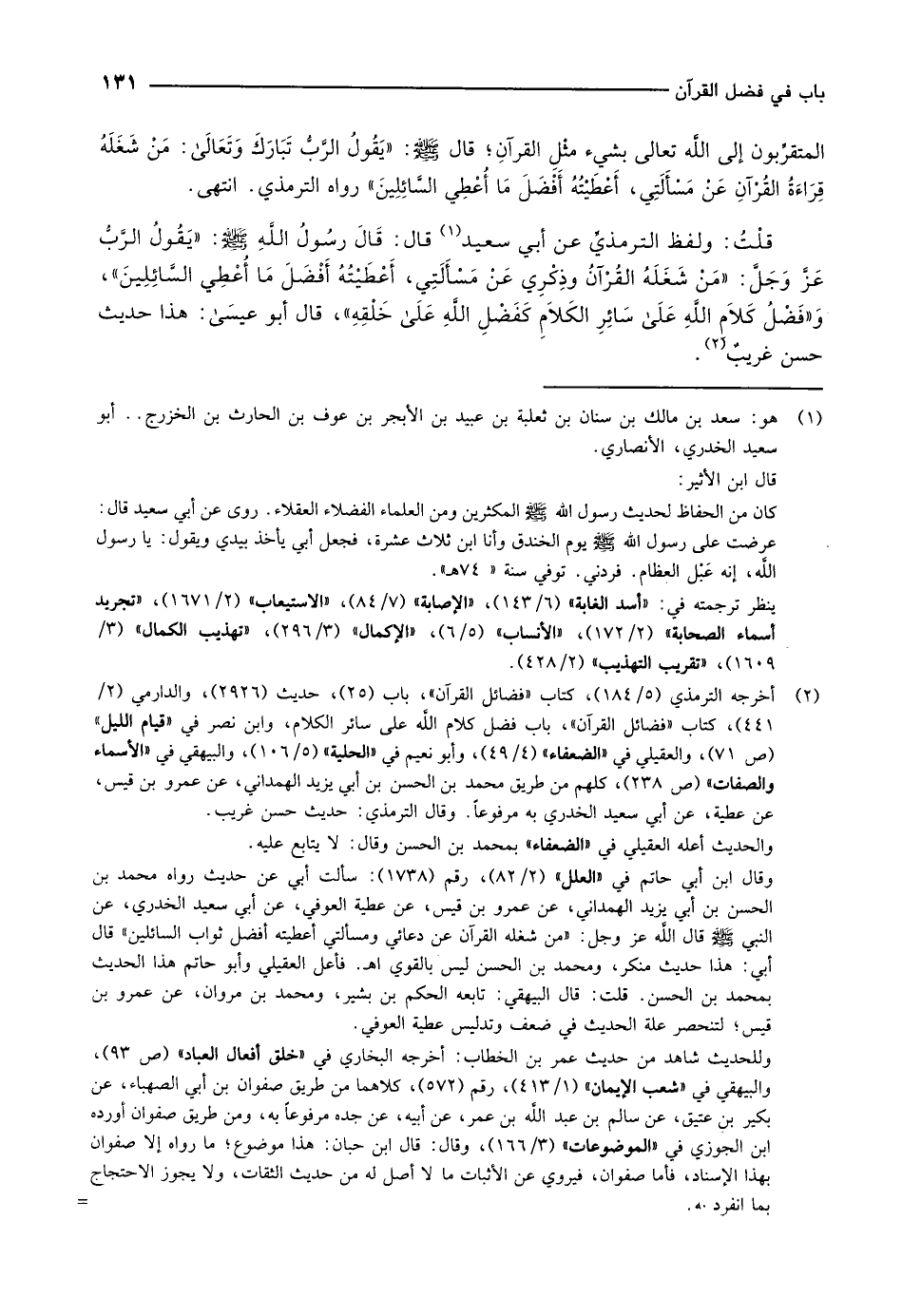 (2) أخرجه الترمذي (5/ 184) ، كتاب «فضائل القرآن» ، باب (25) ، حديث (2926) ، والدارمي (2/ 441) ، كتاب «فضائل القرآن» ، باب فضل كلام الله على سائر الكلام، وابن نصر في «قيام الليل» (ص 71) ، والعقيلي في «الضعفاء» (4/ 49) ، وأبو نعيم في «الحلية» (5/ 106) ، والبيهقي في «الأسماء والصفات» (ص 238) ، كلهم من طريق محمد بن الحسن بن أبي يزيد الهمداني، عن عمرو بن قيس، عن عطية، عن أبي سعيد الخدري به مرفوعا. وقال الترمذي: حديث حسن غريب.