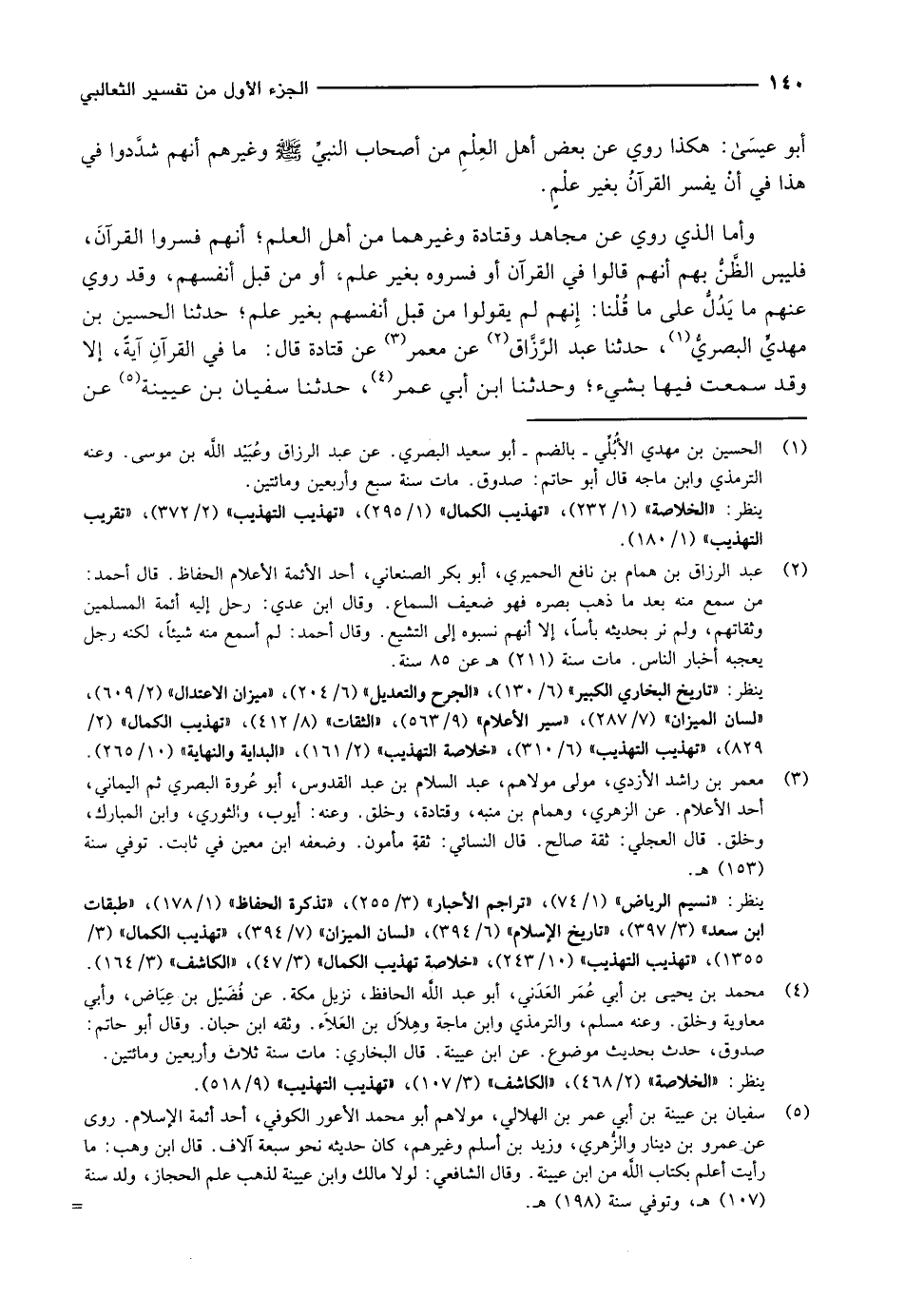 (5) سفيان بن عيينة بن أبي عمر بن الهلالي، مولاهم أبو محمد الأعور الكوفي، أحد أئمة الإسلام. روى عن عمرو بن دينار والزّهري، وزيد بن أسلم وغيرهم، كان حديثه نحو سبعة آلاف. قال ابن وهب: ما رأيت أعلم بكتاب الله من ابن عيينة. وقال الشافعي: لولا مالك وابن عيينة لذهب علم الحجاز، ولد سنة (107) هـ، وتوفي سنة (198) هـ.