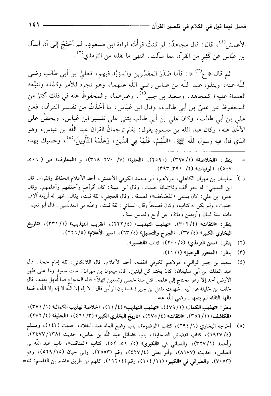 (1) سليمان بن مهران الكاهلي، مولاهم، أبو محمد الكوفي الأعمش، أحد الأعلام الحفاظ والقراء. قال ابن المديني: له نحو ألف وثلاثمائة حديث. وقال ابن عيينة: كان أقرأهم وأحفظهم وأعلمهم. وقال عمرو بن علي: كان يسمى «المصحف» لصدقه. وقال العجلي، ثقة ثبت، يقال: ظهر له أربعة آلاف حديث، ولم يكن له كتاب، وكان فصيحا وقال النسائي: ثقة ثبت. وعدّه من المدلّسين. قال أبو نعيم: