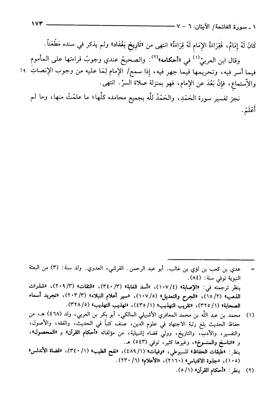 (1) محمد بن عبد الله بن محمد المعافري الأشبيلي المالكي، أبو بكر بن العربي، ولد (468) هـ.، من حفاظ الحديث بلغ رتبة الاجتهاد في علوم الدين، صنف كتبا في الحديث، والفقه، والأصول، والتفسير، والأدب، والتاريخ، وولي قضاء إشبيلية، من مؤلفاته «أحكام القرآن» و «المحصول» ، و «الناسخ والمنسوخ» ، وغيرها كثير، توفي (543) هـ.
