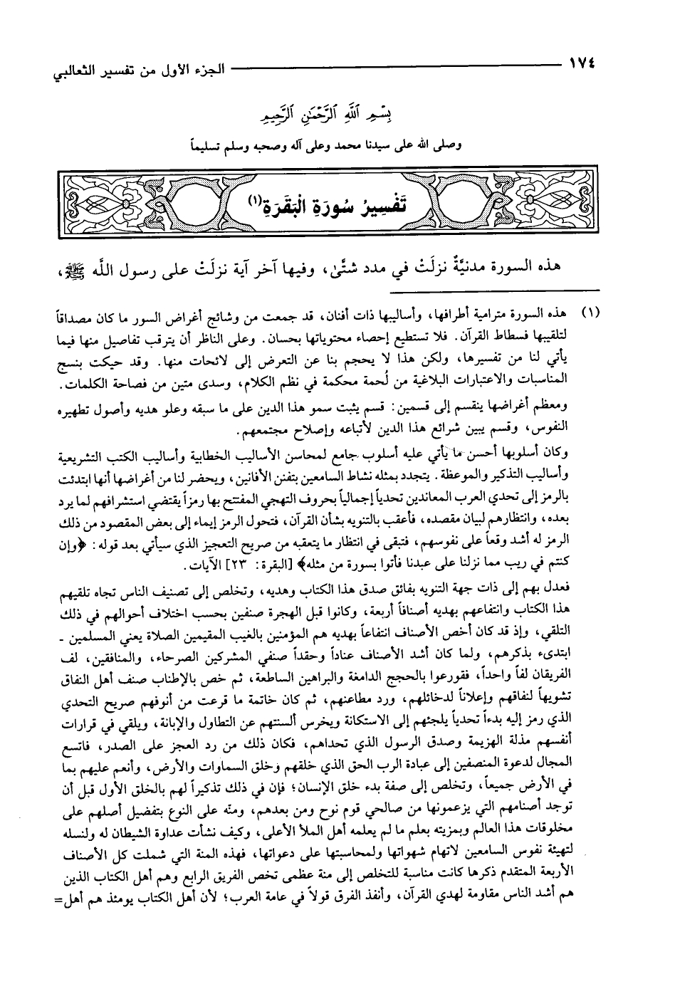 (1) هذه السورة مترامية أطرافها، وأساليبها ذات أفنان، قد جمعت من وشائج أغراض السور ما كان مصداقا لتلقيبها فسطاط القرآن. فلا تستطيع إحصاء محتوياتها بحسان. وعلى الناظر أن يترقب تفاصيل منها فيما يأتي لنا من تفسيرها، ولكن هذا لا يحجم بنا عن التعرض إلى لائحات منها. وقد حيكت بنسج المناسبات والاعتبارات البلاغية من لحمة محكمة في نظم الكلام، وسدى متين من فصاحة الكلمات.