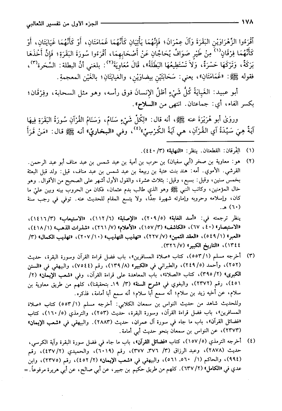 (3) أخرجه مسلم (1/ 553) ، كتاب «صلاة المسافرين» ، باب فضل قراءة القرآن وسورة البقرة، حديث (252) ، وأحمد (5/ 249) ، والطبراني في «الكبير» (8/ 139) ، رقم (7544) ، والبيهقي في «السنن الكبرى» (2/ 395) ، كتاب «الصلاة» ، باب المعاهدة على قراءة القرآن، وفي «شعب الإيمان» (2/ 451) ، رقم (2372) ، والبغوي في «شرح السنة» (3/ 19- بتحقيقنا) ، كلهم من طريق معاوية بن سلام، عن أخيه زيد بن سلام أنه سمع أبا سلام أنه سمع أبا أمامة، فذكره.