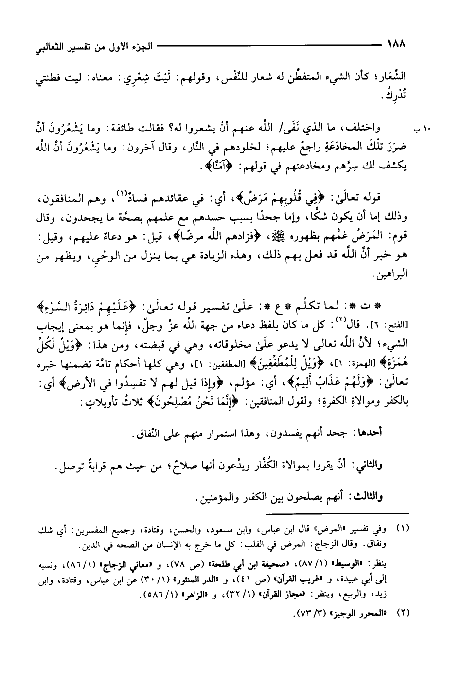 (1) وفي تفسير «المرض» قال ابن عباس، وابن مسعود، والحسن، وقتادة، وجميع المفسرين: أي شك ونفاق. وقال الزجاج: المرض في القلب: كل ما خرج به الإنسان من الصحة في الدين.