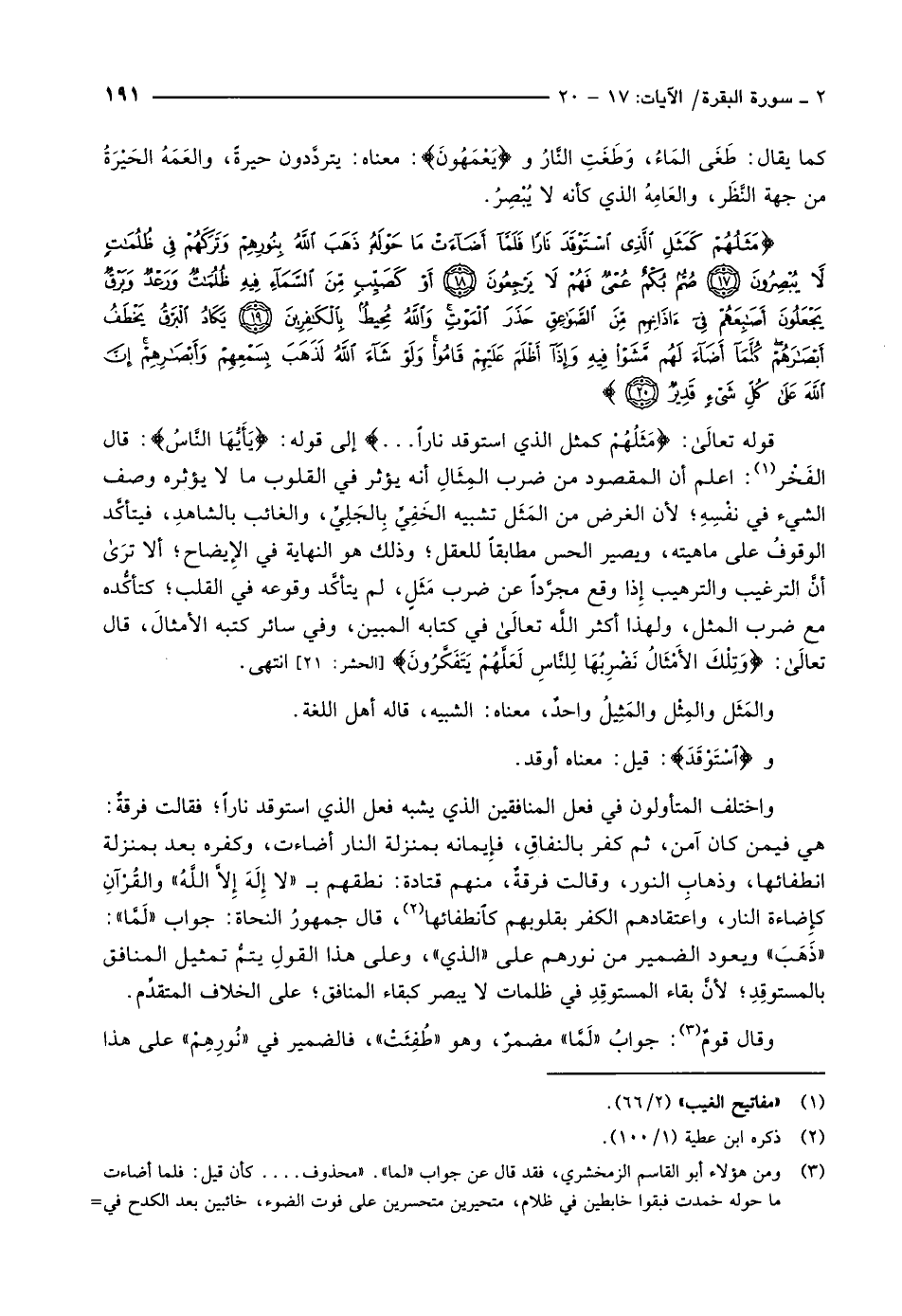 قوله تعالى: مَثَلُهُمْ كَمَثَلِ الَّذِي اسْتَوْقَدَ نَاراً ... إلى قوله: يا أَيُّهَا النَّاسُ: قال الفَخْر «1» : اعلم أن المقصود من ضرب المِثَالِ أنه يؤثر في القلوب ما لا يؤثره وصف الشيء في نفْسِهِ لأن الغرض من المَثَل تشبيه الخَفِيِّ بِالجَلِيِّ، والغائب بالشاهدِ، فيتأكَّد الوقوفُ على ماهيته، ويصير الحس مطابقاً للعقل وذلك هو النهاية في الإِيضاح ألا ترى أنَّ الترغيب والترهيب إِذا وقع مجرَّداً عن ضرب مَثَلٍ، لم يتأكَّد وقوعه في القلب كتأكُّده مع ضرب المثل، ولهذا أكثر اللَّه تعالى في كتابه المبين، وفي سائر كتبه الأمثالَ، قال تعالى: وَتِلْكَ الْأَمْثالُ نَضْرِبُها لِلنَّاسِ لَعَلَّهُمْ يَتَفَكَّرُونَ [الحشر: 21] انتهى.