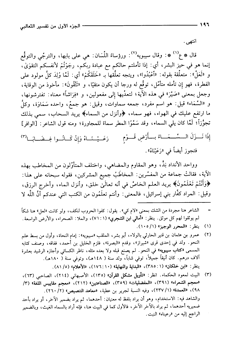 (2) عمرو بن عثمان بن قنير الحارثي بالولاء، أبو بشر، الملقب «سيبويه» : إمام النحاة، وأول من بسط علم النحو. ولد في إحدى قرى «شيراز» ، وقدم «البصرة» ، فلزم الخليل بن أحمد، ففاقه، وصنف كتابه المسمى «كتاب سيبويه» في النحو. لم يصنع قبله ولا بعده مثله، ناظر الكسائي وأجازه الرشيد بعشرة آلاف درهم. كان أنيقا جميلا، توفي شابا، ولد سنة (148 هـ.) وتوفي سنة (180 هـ.) .