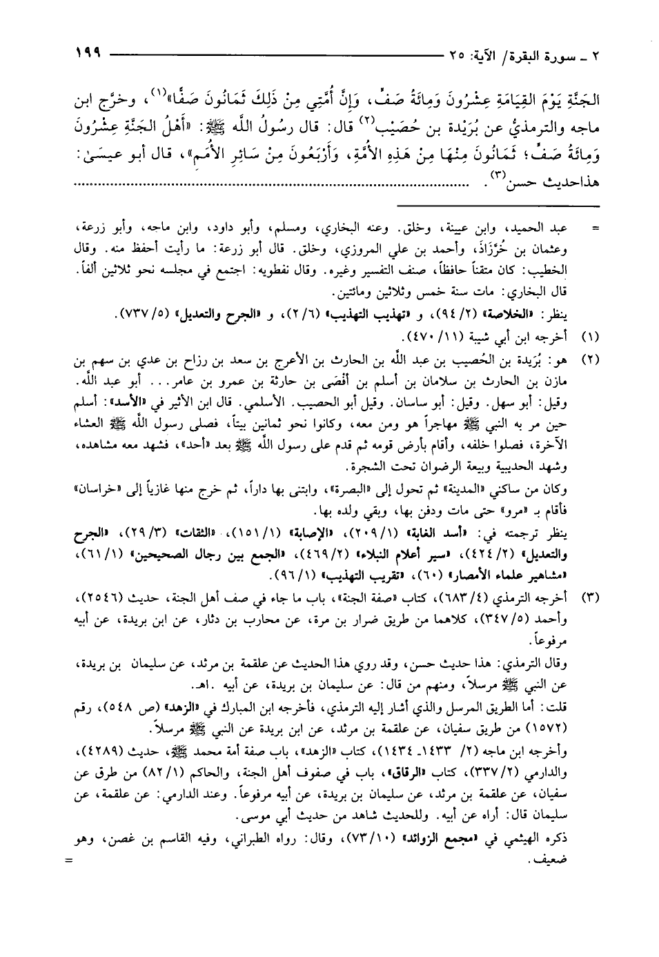 (3) أخرجه الترمذي (4/ 683) ، كتاب «صفة الجنة» ، باب ما جاء في صف أهل الجنة، حديث (2546) ، وأحمد (5/ 347) ، كلاهما من طريق ضرار بن مرة، عن محارب بن دثار، عن ابن بريدة، عن أبيه مرفوعا.