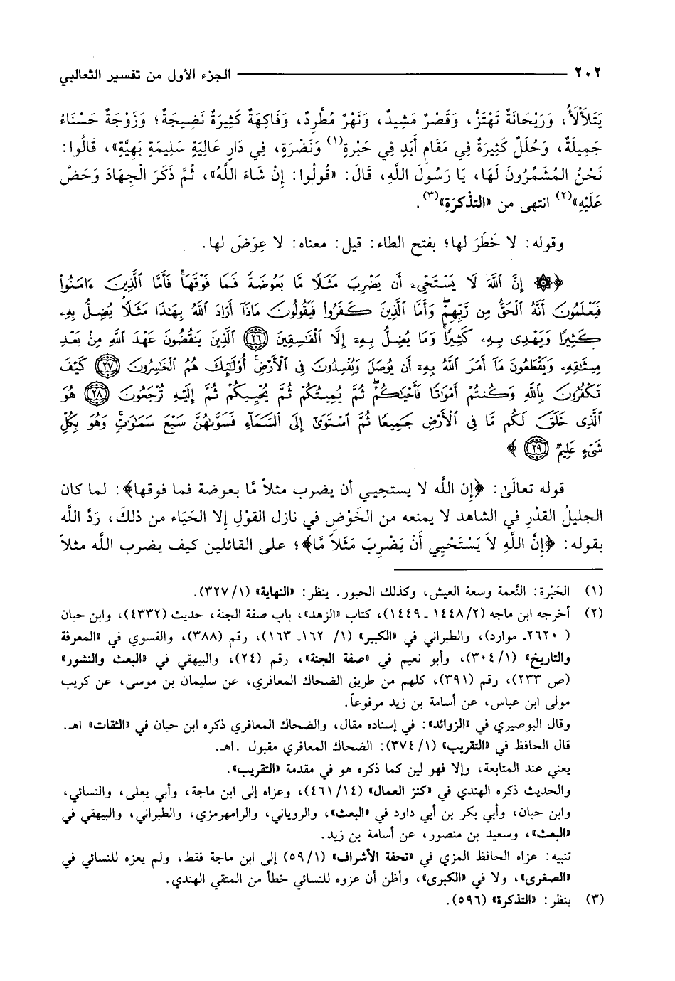 قوله تعالى: إِنَّ اللَّهَ لا يَسْتَحْيِي أَنْ يَضْرِبَ مَثَلًا مَّا بَعُوضَةً فَما فَوْقَها: لما كان الجليلُ القدْرِ في الشاهد لا يمنعه من الخَوْضِ في نازل القوْلِ إِلا الحَيَاء من ذلكَ، رَدَّ اللَّه بقوله: إِنَّ اللَّهَ لا يَسْتَحْيِي أَنْ يَضْرِبَ مَثَلًا مَّا على القائلين كيف يضرب الله مثلا