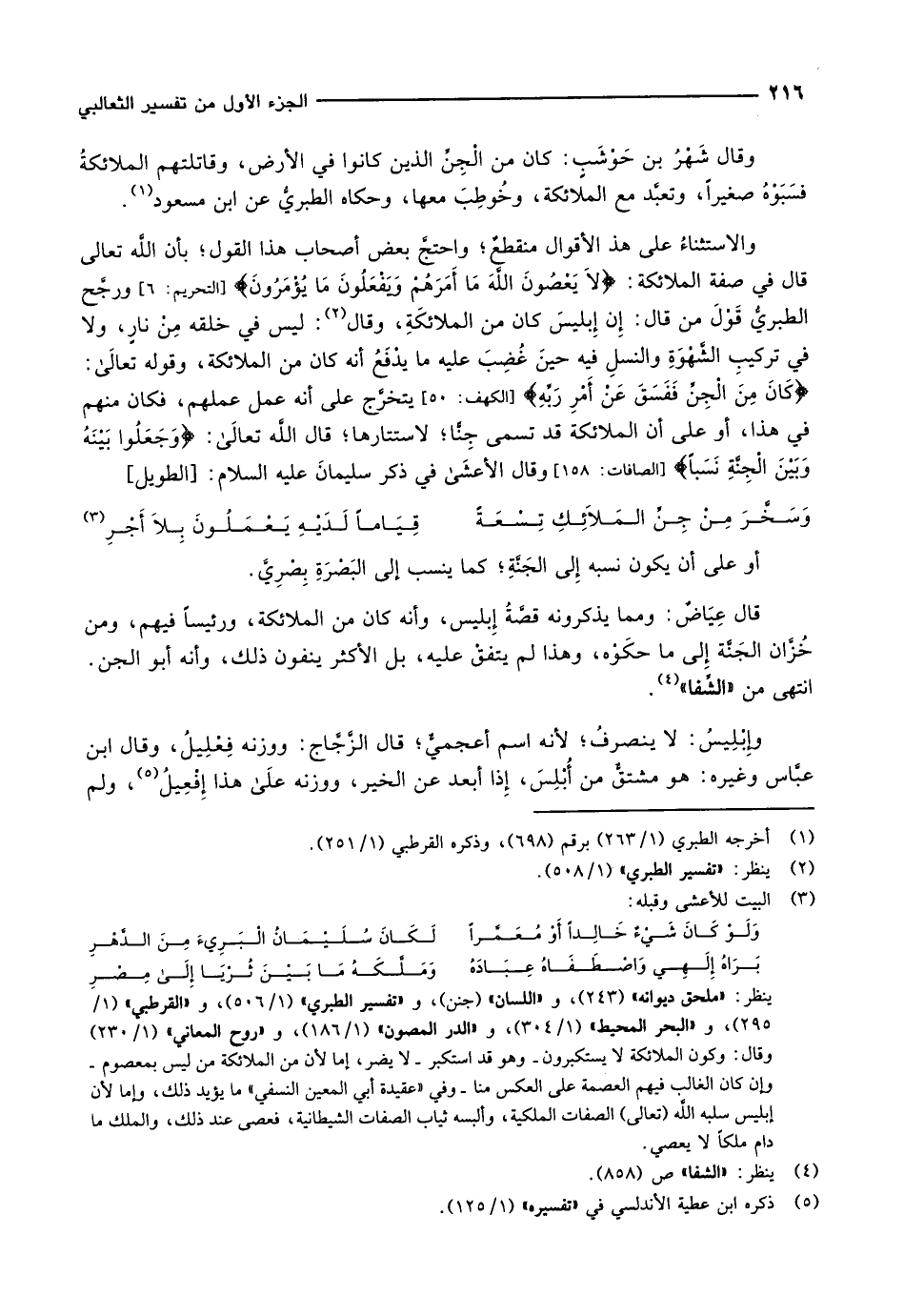 ينظر: «ملحق ديوانه» (243) ، و «اللسان» (جنن) ، و «تفسير الطبري» (1/ 506) ، و «القرطبي» (1/ 295) ، و «البحر المحيط» (1/ 304) ، و «الدر المصون» (1/ 186) ، و «روح المعاني» (1/ 230) وقال: وكون الملائكة لا يستكبرون- وهو قد استكبر- لا يضر، إما لأن من الملائكة من ليس بمعصوم- وإن كان الغالب فيهم العصمة على العكس منا- وفي «عقيدة أبي المعين النسفي» ما يؤيد ذلك، وإما لأن إبليس سلبه الله (تعالى) الصفات الملكية، وألبسه ثياب الصفات الشيطانية، فعصى عند ذلك، والملك ما دام ملكا لا يعصي.