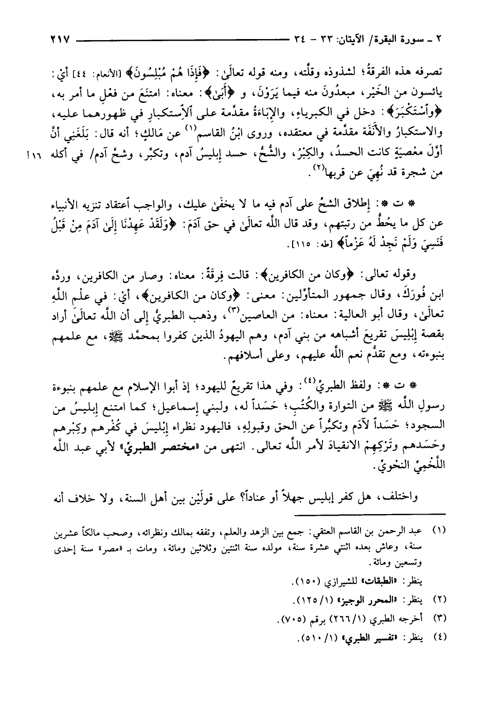 وقوله تعالى: وَكانَ مِنَ الْكافِرِينَ: قالت فِرقَةٌ: معناه: وصار من الكافرين، وردَّه ابن فُورَكَ، وقال جمهور المتأوِّلين: معنى: وَكانَ مِنَ الْكافِرِينَ، أيْ: في علْمِ اللَّهِ تعالى، وقال أبو العالية: معناه: من العاصين «3» ، وذهب الطبريُّ إِلى أن اللَّه تعالى أراد بقصة إبْلِيسَ تقريعَ أشباهه من بني آدم، وهم اليهود الذين كفروا بمحمّد صلّى الله عليه وسلم، مع علمهم بنبوءته، ومع تقدُّم نعم اللَّه عليهم، وعلى أسلافهم.